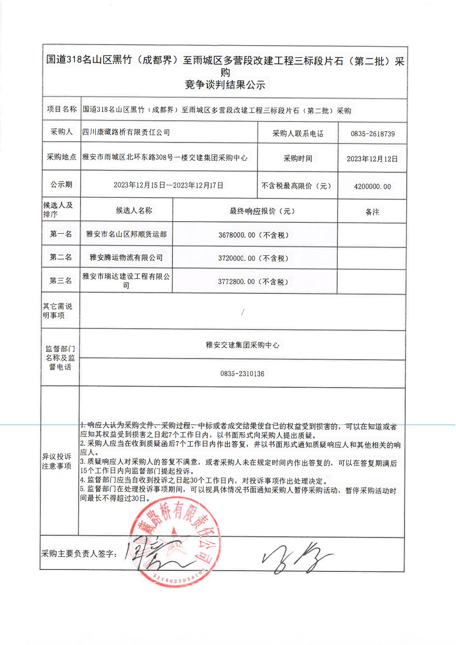 四川康藏路橋有限責(zé)任公司國道318名山區(qū)黑竹(成都界)至雨城區(qū)多營段改建工程三標(biāo)段片石(第二批)采購競(jìng)爭(zhēng)談判結(jié)果
