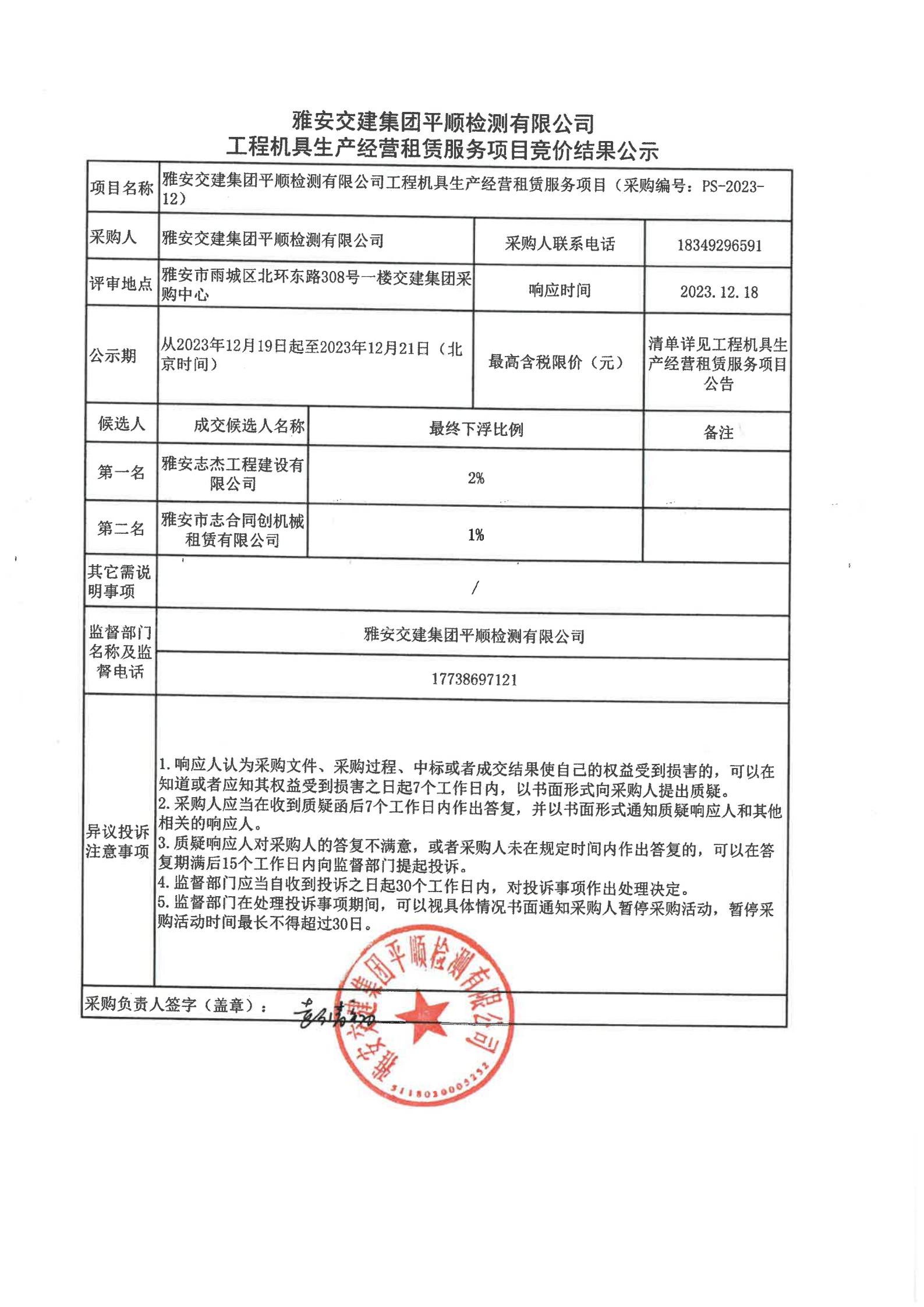 雅安交建集團(tuán)平順檢測有限公司工程機(jī)具生產(chǎn)經(jīng)營租賃服務(wù)項(xiàng)目競價(jià)結(jié)果公示