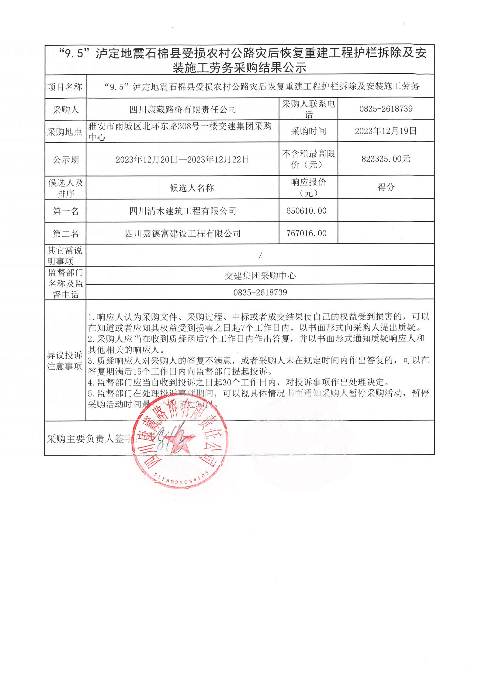 四川康藏路橋有限責任公司“9.5”瀘定地震石棉縣受損農村公路災后恢復重建工程護欄拆除及安裝施工勞務采購結果公示