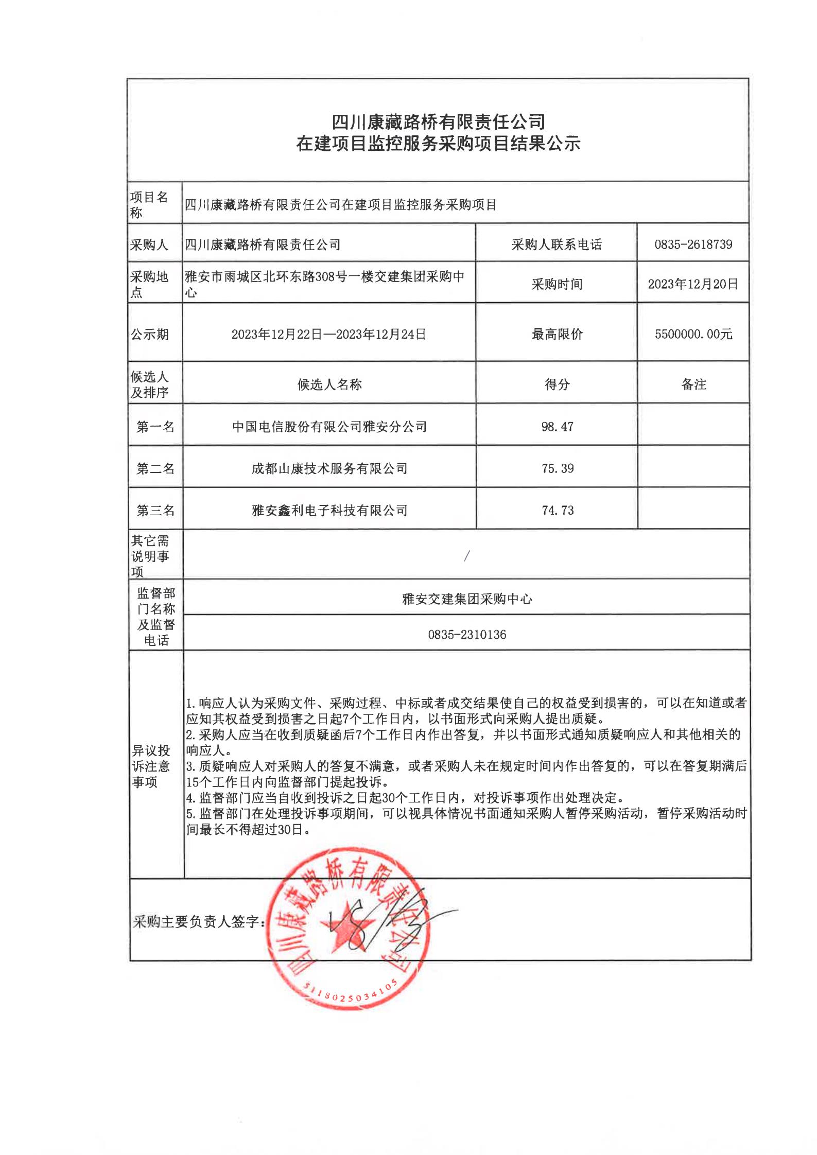四川康藏路橋有限責任公司在建項目監(jiān)控服務采購項目結果公示