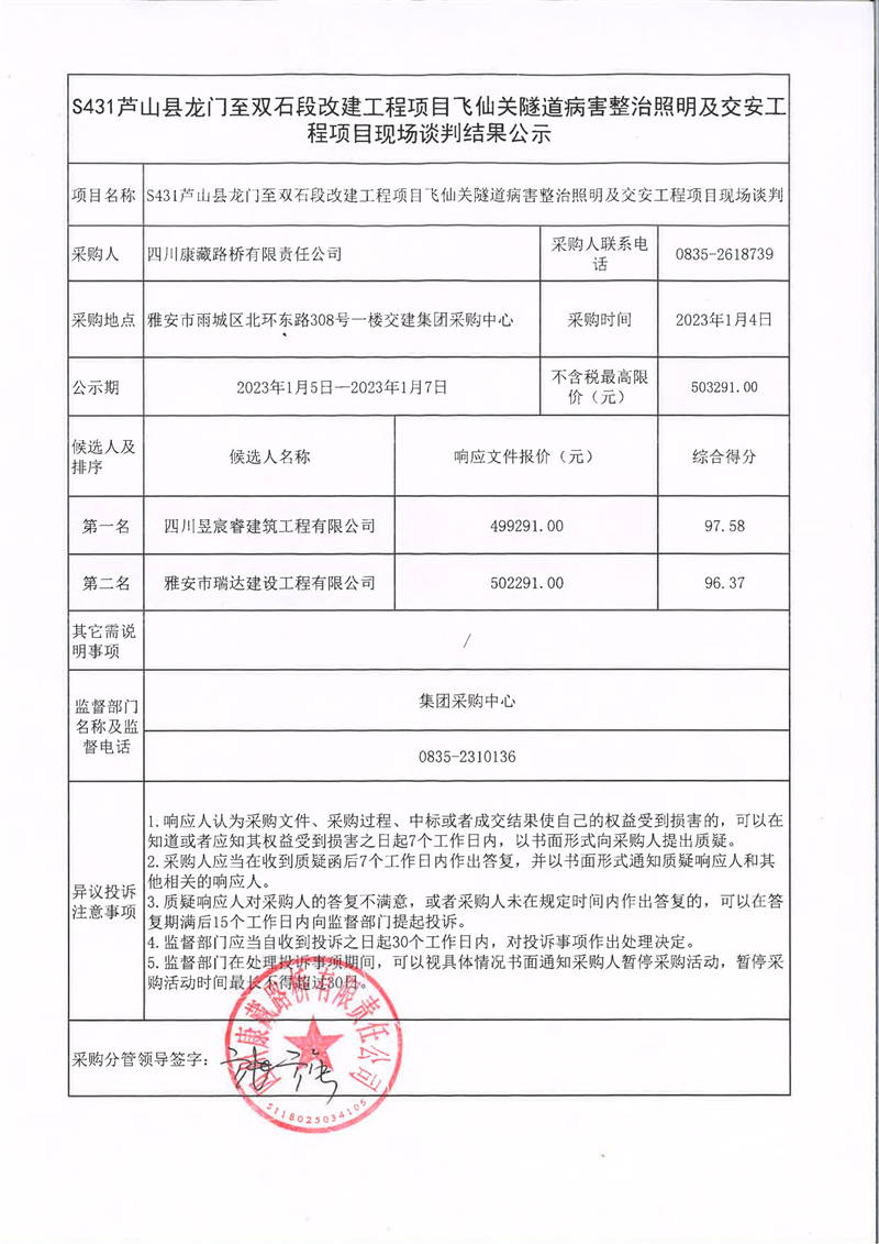 四川康藏路橋有限責(zé)任公司S431蘆山縣龍門至雙石段改建工程項(xiàng)目飛仙關(guān)隧道病害整治照明及交安工程項(xiàng)目現(xiàn)場談判結(jié)果公示
