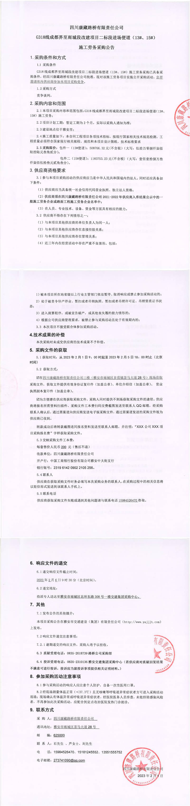 四川康藏路橋有限責(zé)任公司G318線成都界至雨城段改建項目二標段進場便道(13#、15#)施工勞務(wù)采購公告