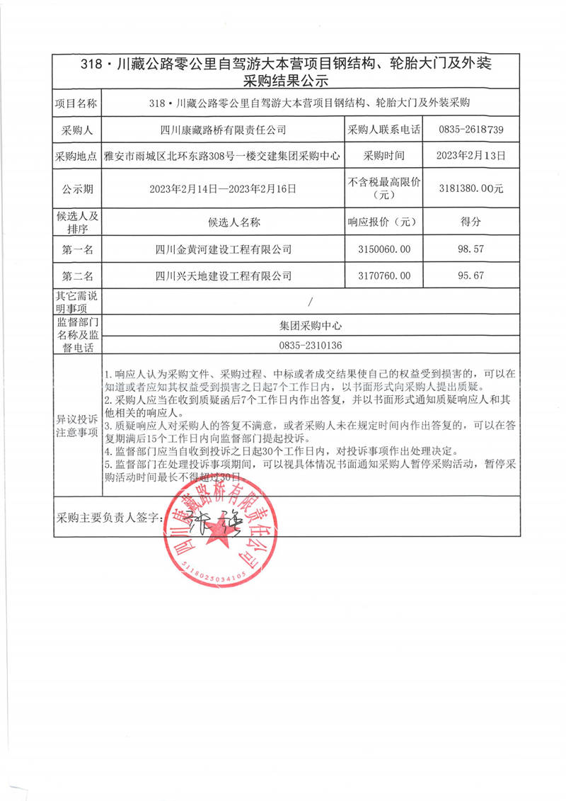 四川康藏路橋有限責(zé)任公司318.川藏公路零公里自駕游大本營項目鋼結(jié)構(gòu)、輪胎大門及外裝采購結(jié)果公示