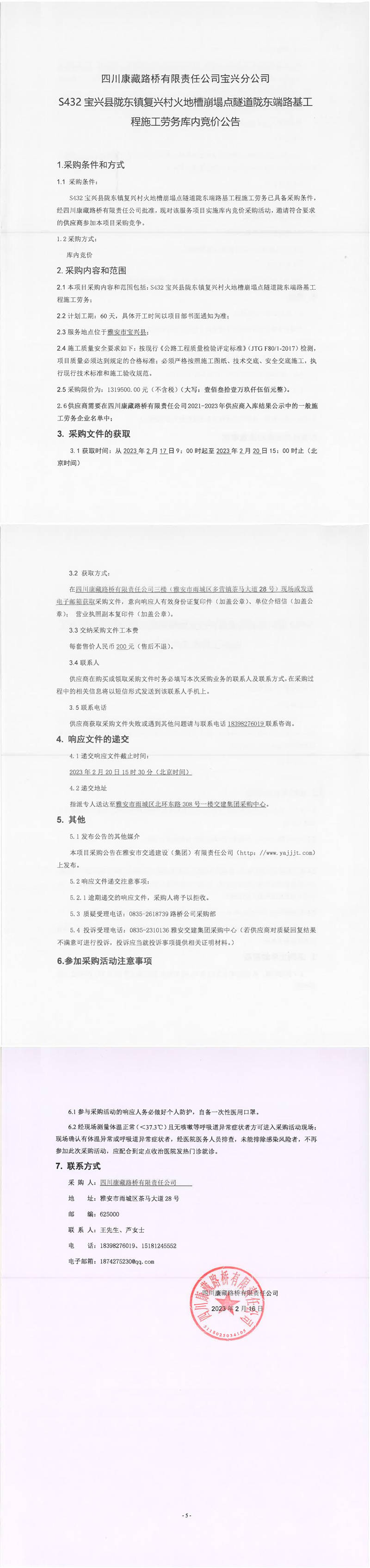 四川康藏路橋有限責(zé)任公司S432寶興縣隴東鎮(zhèn)復(fù)興村火地槽崩塌點隧道隴東端路基工程施工勞務(wù)庫內(nèi)競價公告