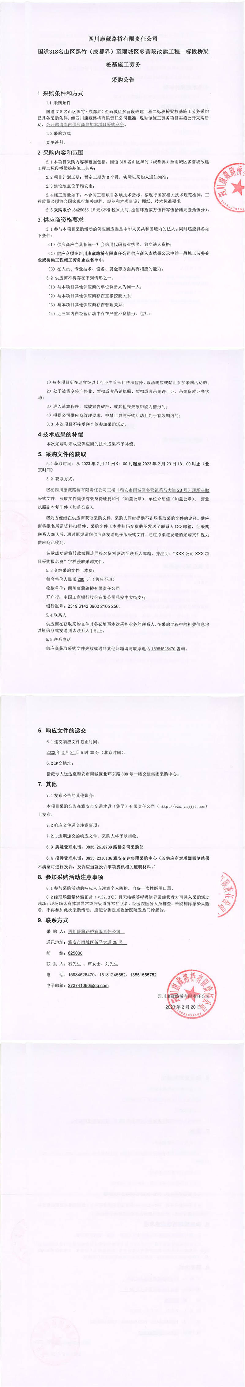 四川康藏路橋有限責任公司國道318名山區(qū)黑竹(成都界)至雨城區(qū)多營段改建工程二標段橋梁樁基施工勞務(wù)
