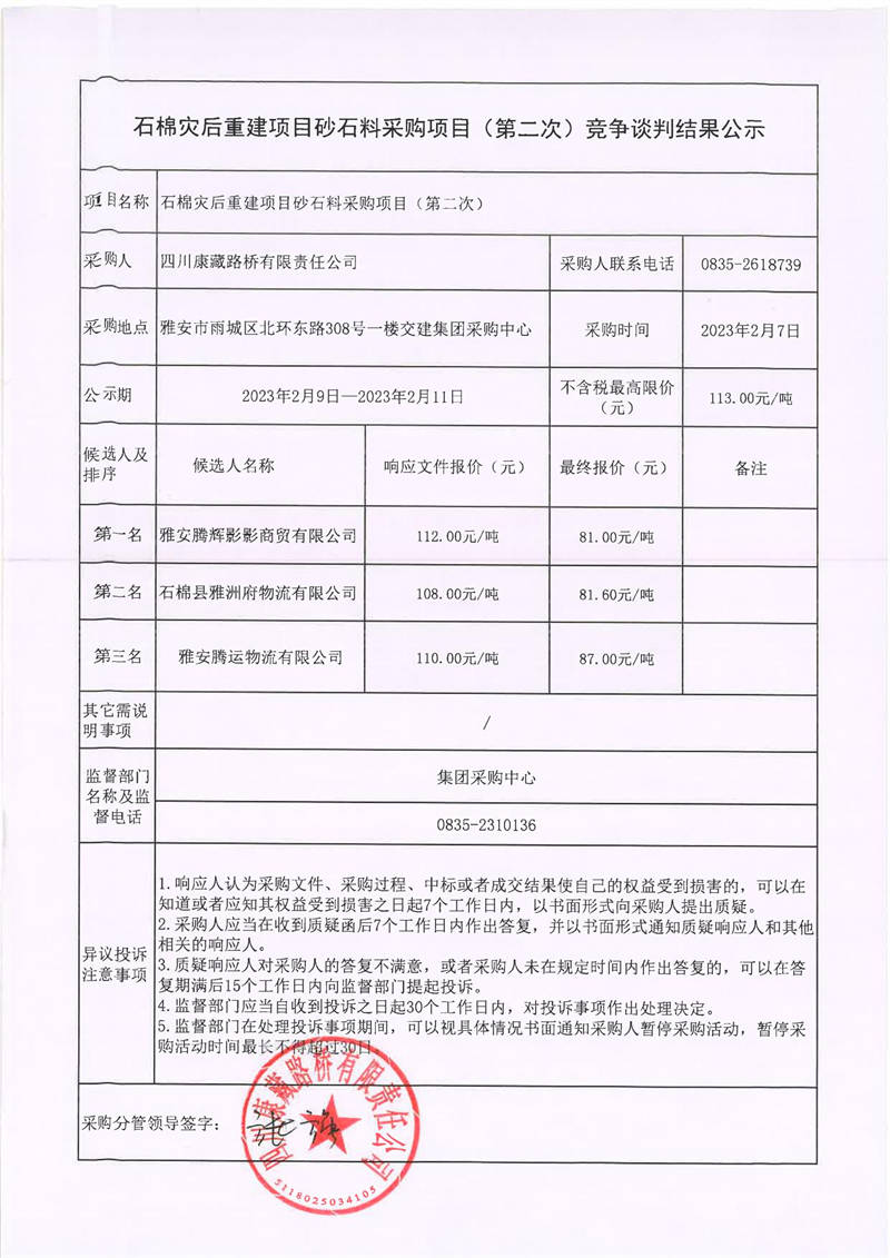 四川康藏路橋有限責(zé)任公司石棉災(zāi)后重建項(xiàng)目砂石料采購項(xiàng)目(第二次)競(jìng)爭(zhēng)談判結(jié)果公示