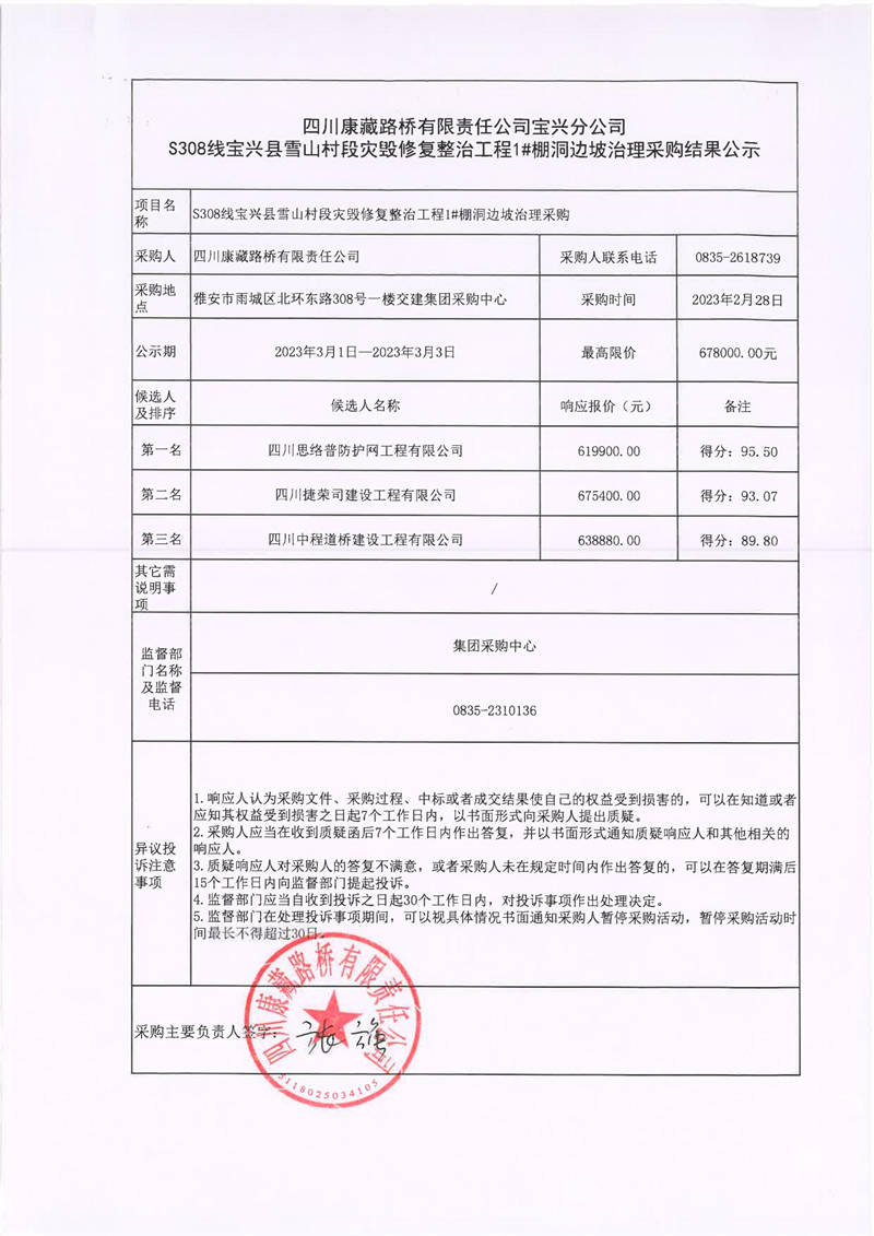 四川康藏路橋有限責任公司寶興分公司S308線寶興縣雪山村段災(zāi)毀修復(fù)整治工程1#棚洞邊坡治理采購結(jié)果公示