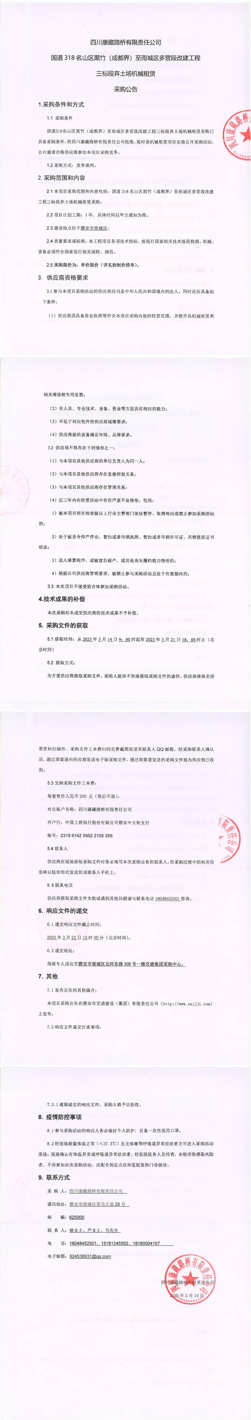 四川康藏路橋有限責(zé)任公司國道318名山區(qū)黑竹(成都界)至雨城區(qū)多營段改建工程三標(biāo)段棄土場機械租賃采購公告