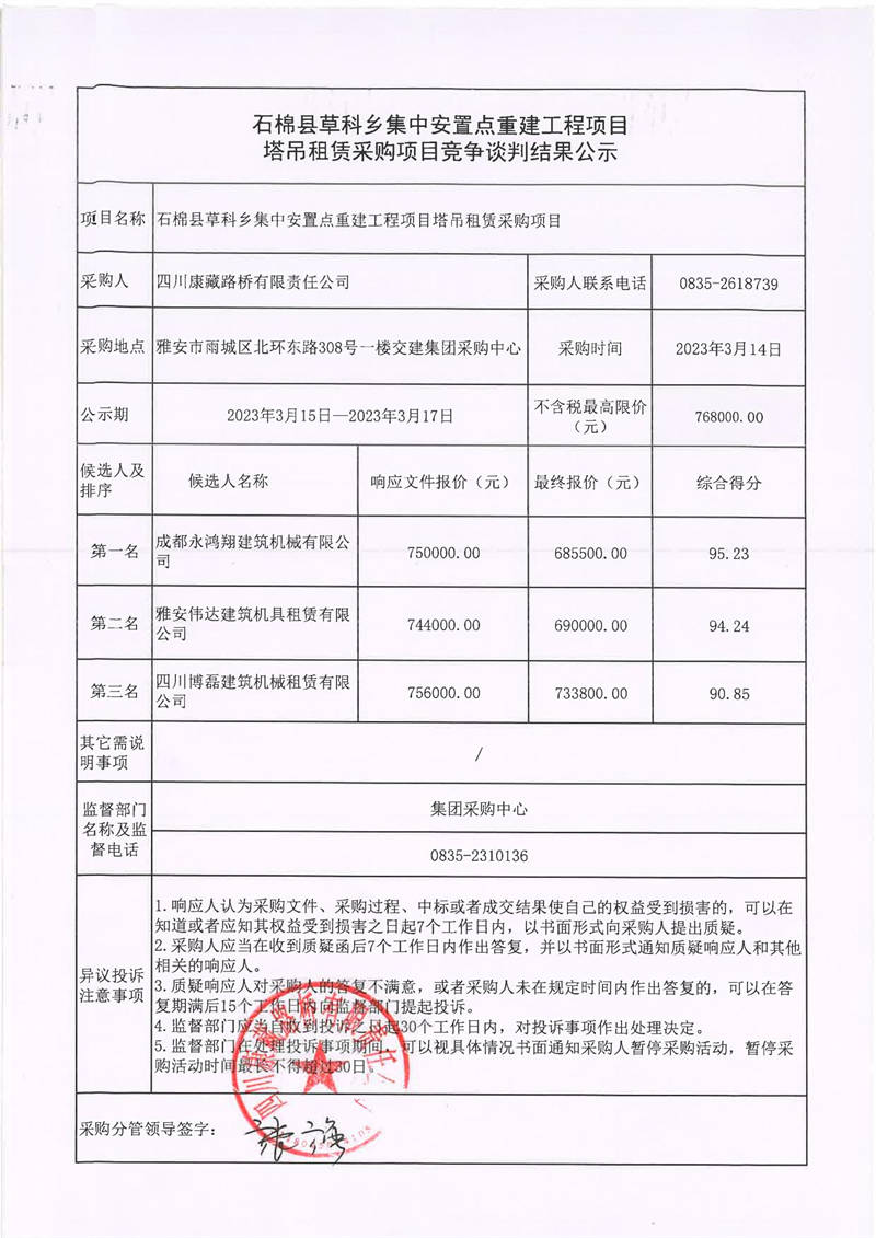 四川康藏路橋有限責任公司石棉草科鄉(xiāng)集中安置點重建工程項目塔吊租賃采購競爭談判結(jié)果公示