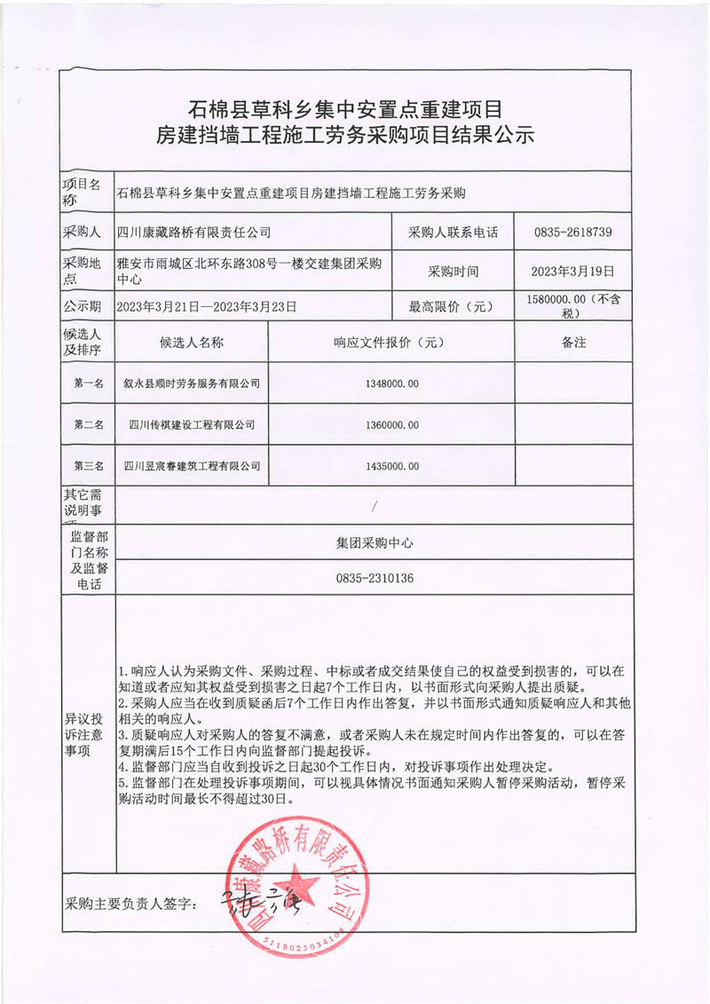 四川康藏路橋有限責(zé)任公司石棉縣草科鄉(xiāng)集中安置點重建項目房建擋墻工程施工勞務(wù)采購項目結(jié)果公示