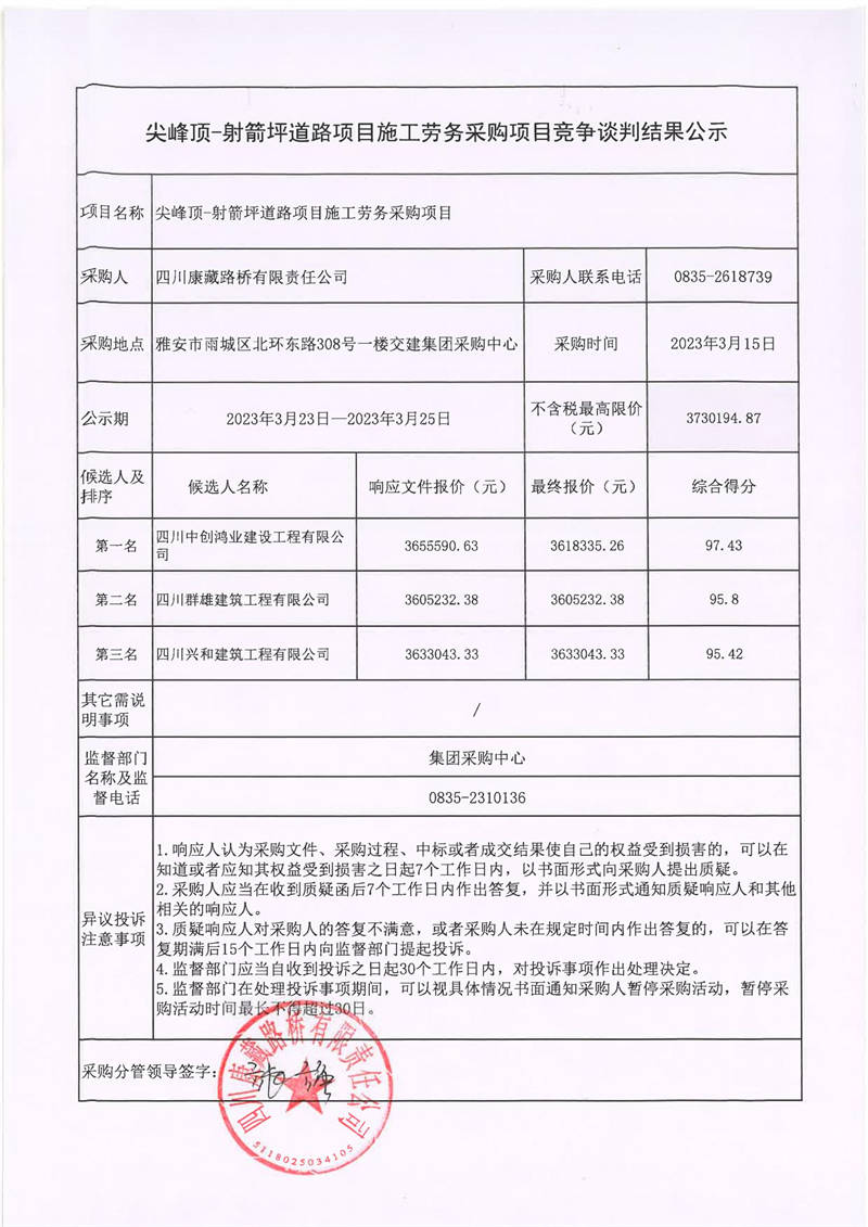 四川康藏路橋有限責(zé)任公司尖峰頂-射箭坪道路項(xiàng)目施工勞務(wù)采購項(xiàng)目競(jìng)爭(zhēng)談判結(jié)果公示