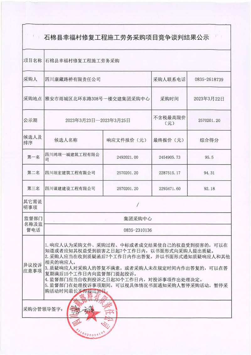 四川康藏路橋有限責(zé)任公司石棉縣幸福村修復(fù)工程施工勞務(wù)采購項(xiàng)目競(jìng)爭(zhēng)談判結(jié)果公示