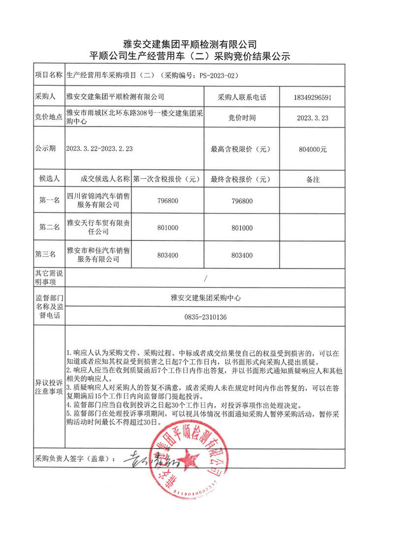 雅安交建集團平順檢測有限公司平順公司生產經營用車(二)采購競價結果公示
