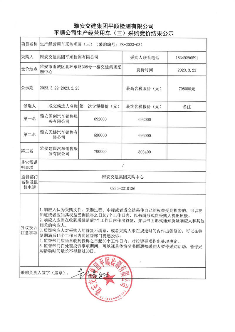 雅安交建集團平順檢測有限公司平順公司生產(chǎn)經(jīng)營用車(三)采購競價結(jié)果公示