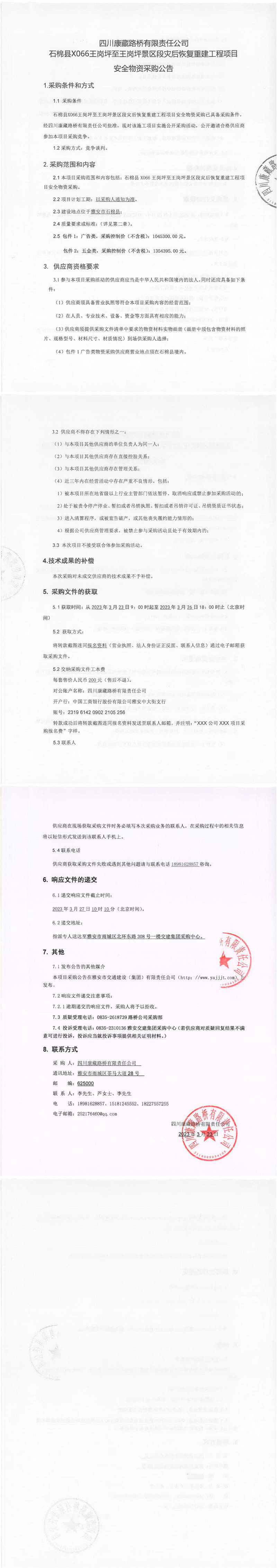 四川康藏路橋有限責任公司石棉縣X066王崗坪至王崗坪景區(qū)段災(zāi)后恢復(fù)重建工程項目安全物資采購公告