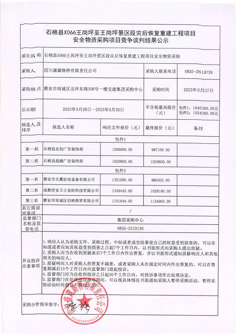 四川康藏路橋有限責(zé)任公司石棉縣X066王崗坪至王崗坪景區(qū)段災(zāi)后恢復(fù)重建工程項(xiàng)目安全物資采購項(xiàng)目競(jìng)爭(zhēng)談判結(jié)果公示