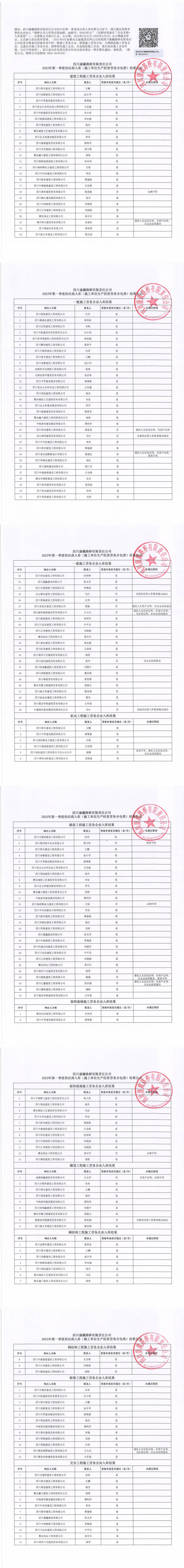 四川康藏路橋有限責(zé)任公司2023年第一季度供應(yīng)商入庫(施工單位生產(chǎn)經(jīng)營勞務(wù)分包類)結(jié)果公示