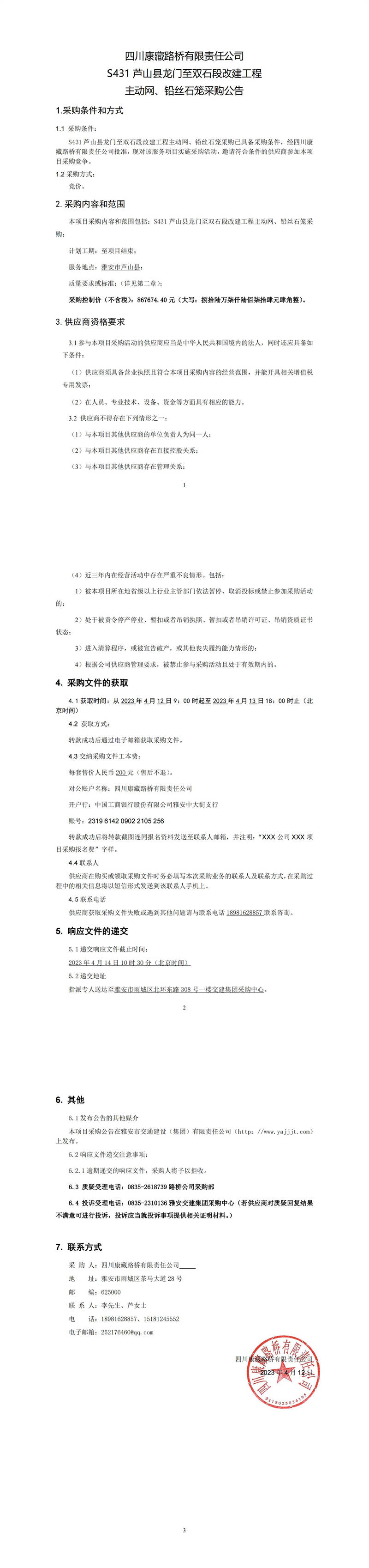 四川康藏路橋有限責任公司S431蘆山縣龍門至雙石段改建工程主動網(wǎng)、鉛絲籠采購公告