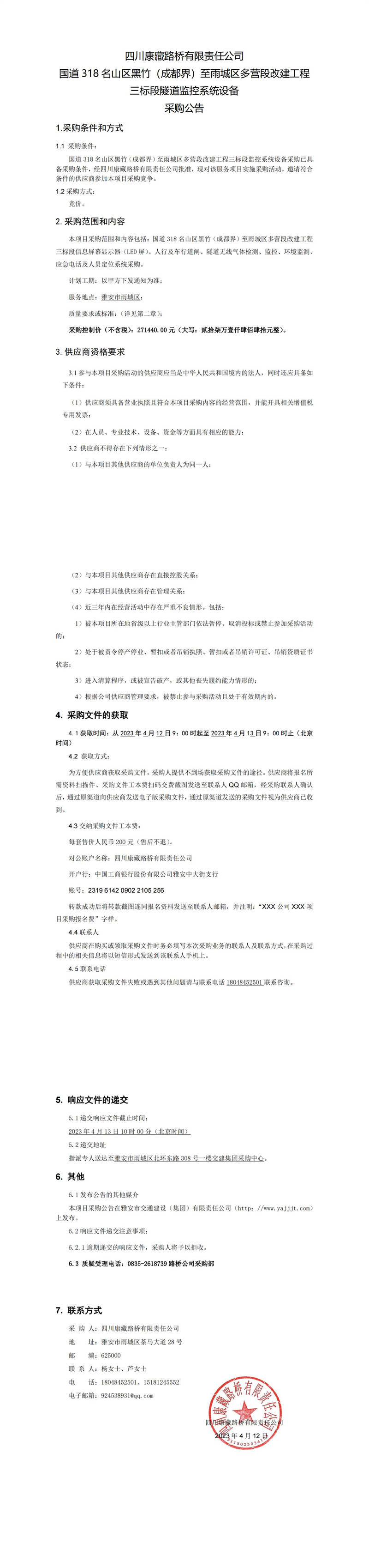 四川康藏路橋有限責(zé)任公司國道318名山區(qū)黑竹(成都界)至雨城區(qū)多營段改建工程三標段隧道監(jiān)控系統(tǒng)設(shè)備采購公告
