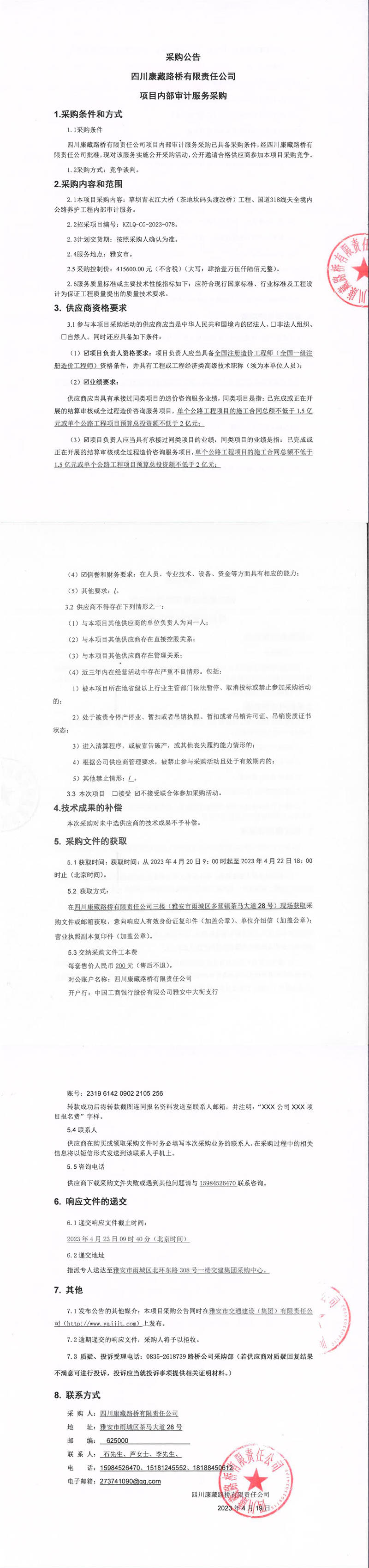 四川康藏路橋有限責任公司項目內(nèi)部審計服務采購公告