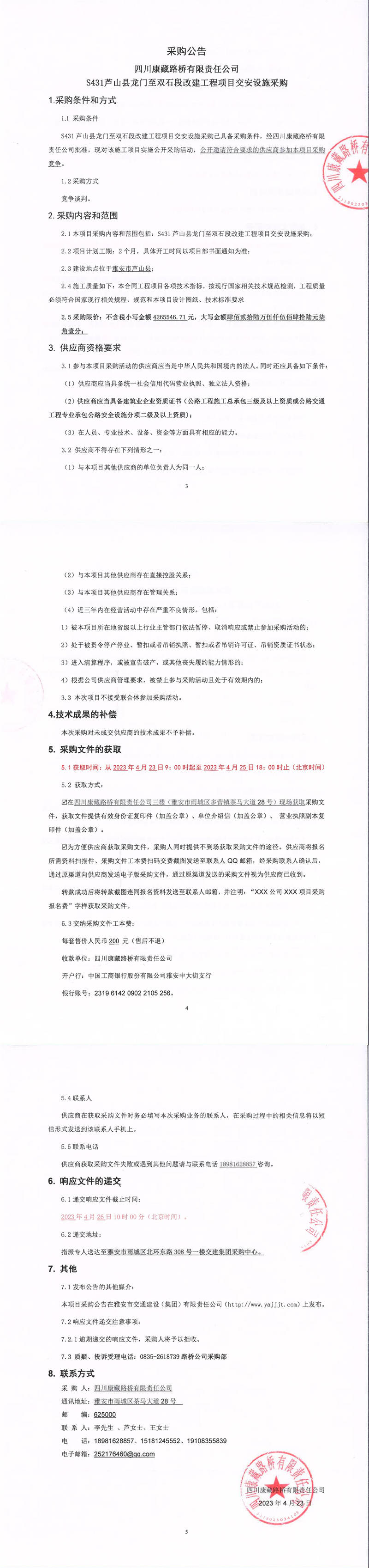 四川康藏路橋有限責(zé)任公司S431蘆山縣龍門(mén)至雙石段改建工程項(xiàng)目交安設(shè)施采購(gòu)