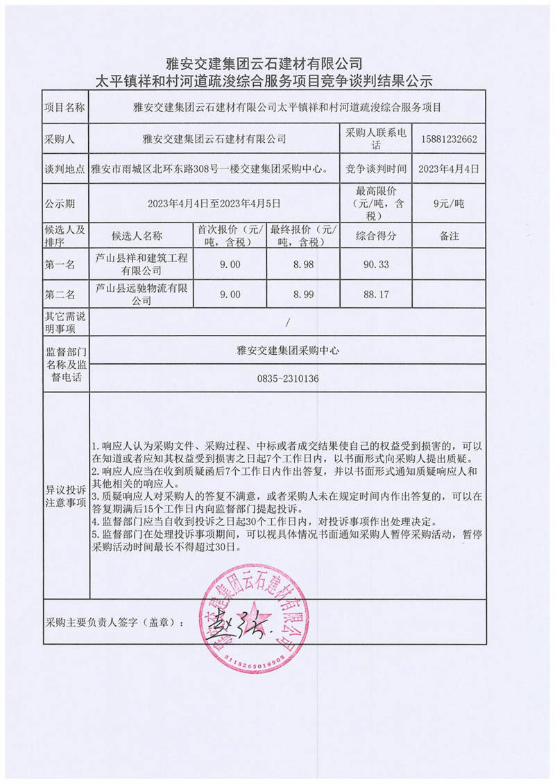 雅安交建集團(tuán)云石建材有限公司太平鎮(zhèn)祥和村河道疏浚綜合服務(wù)項(xiàng)目競爭談判結(jié)果公示