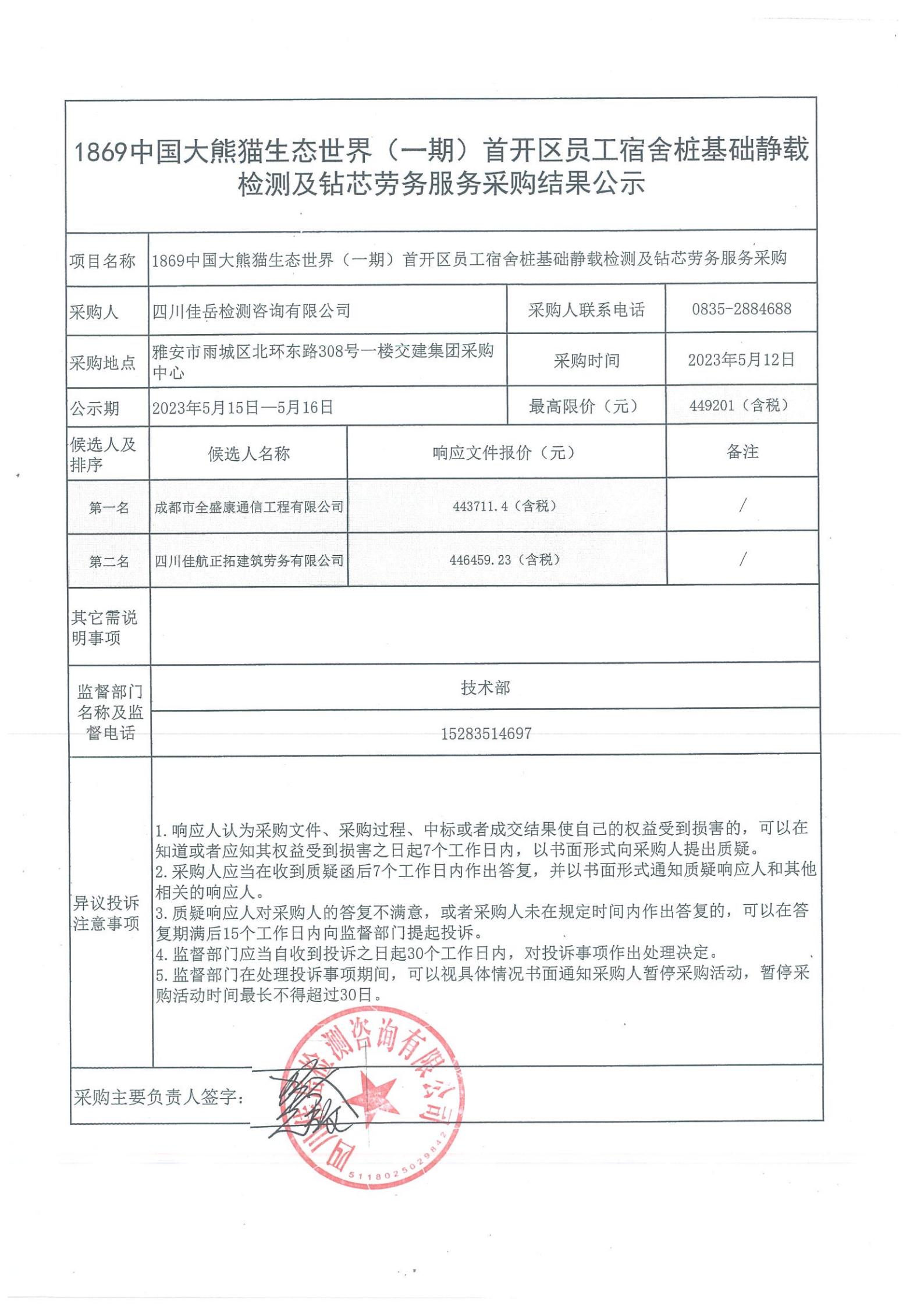 四川佳岳檢測咨詢有限公司關于1869中國大熊貓生態(tài)世界(一期)首開區(qū)員工宿舍樁基礎靜載檢測勞務及鉆芯項目中標結果公示