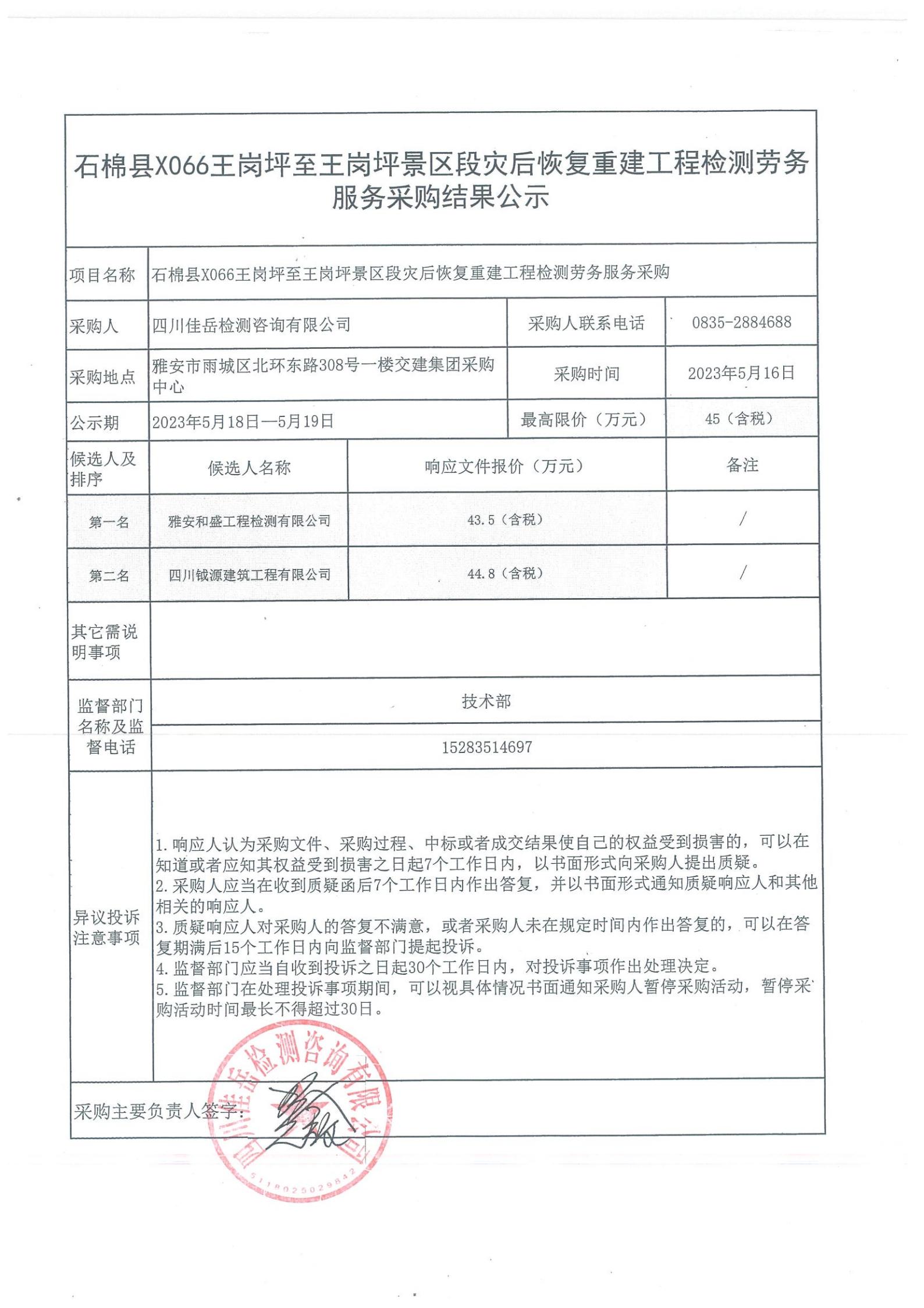 四川佳岳檢測咨詢有限公司石棉縣X066王崗坪至王崗坪景區(qū)段災(zāi)后恢復(fù)重建工程檢測勞務(wù)服務(wù)采購結(jié)果公示