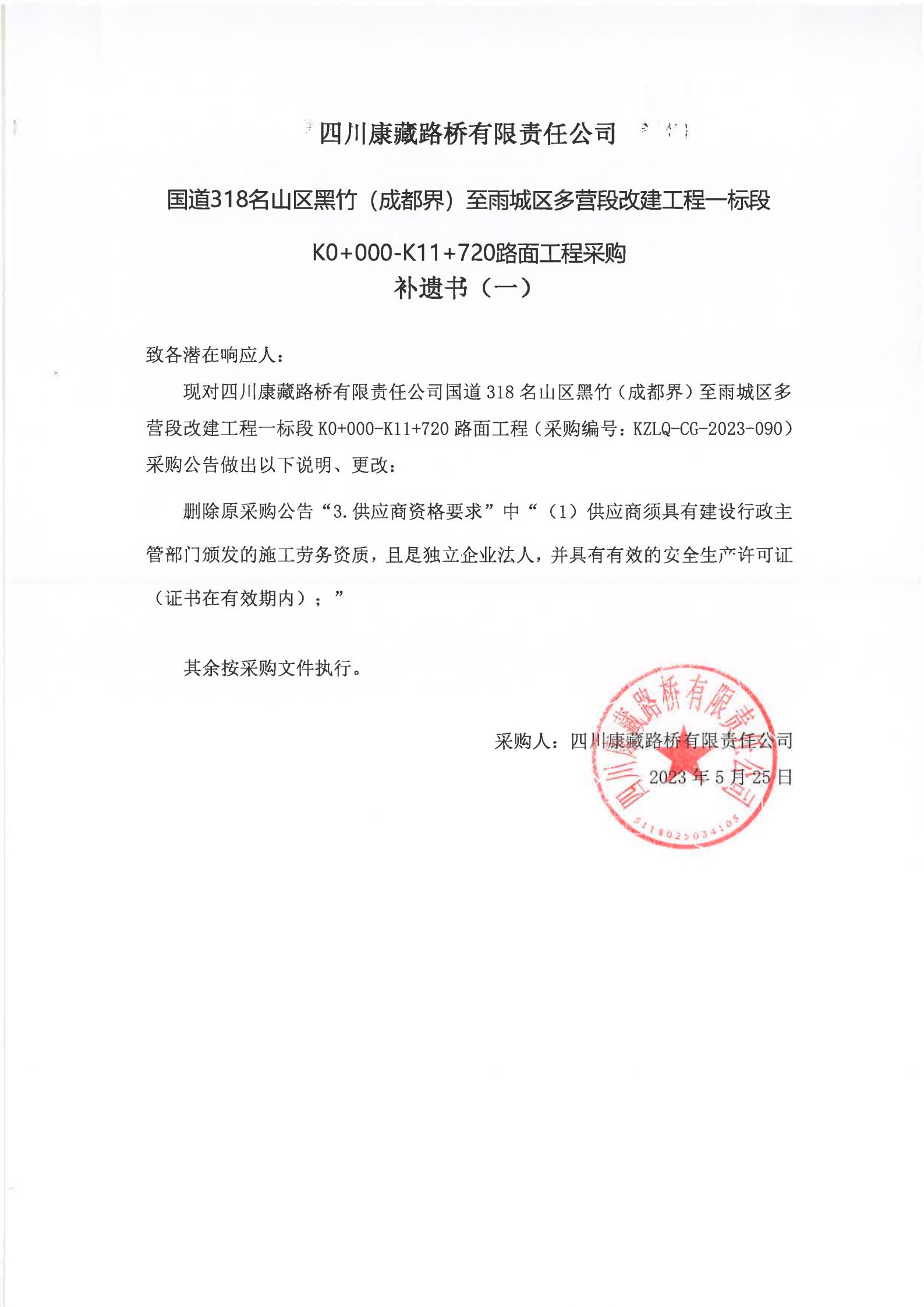 四川康藏路橋有限責(zé)任公司國(guó)道318名山區(qū)黑竹(成都界)至雨城區(qū)多營(yíng)段改建工程一標(biāo)段K0+000-K11+720路面工程采購(gòu)補(bǔ)遺書(一)