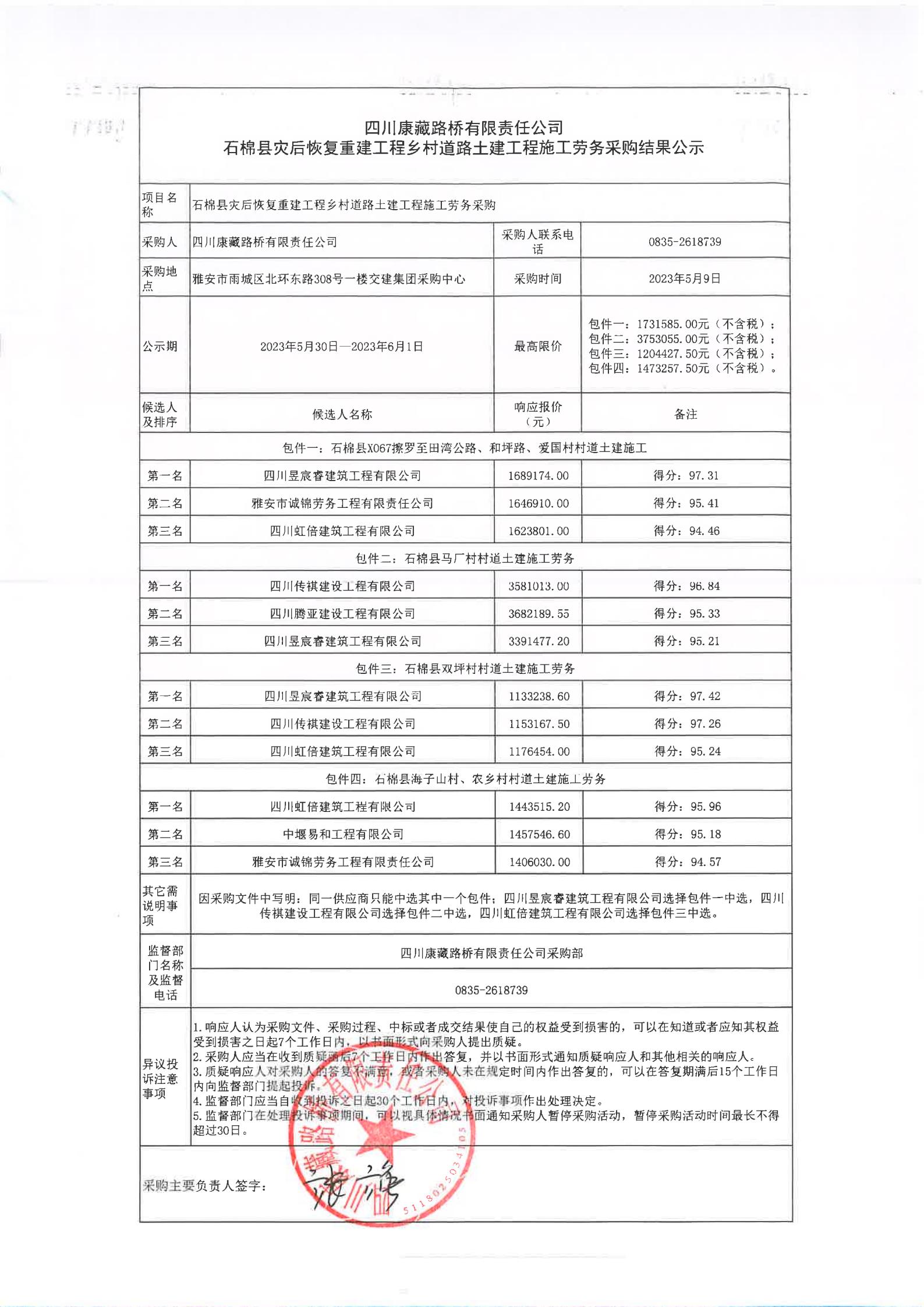 四川康藏路橋有限責任公司石棉縣災后恢復重建工程鄉(xiāng)村道路土建工程施工勞務采購結(jié)果公示
