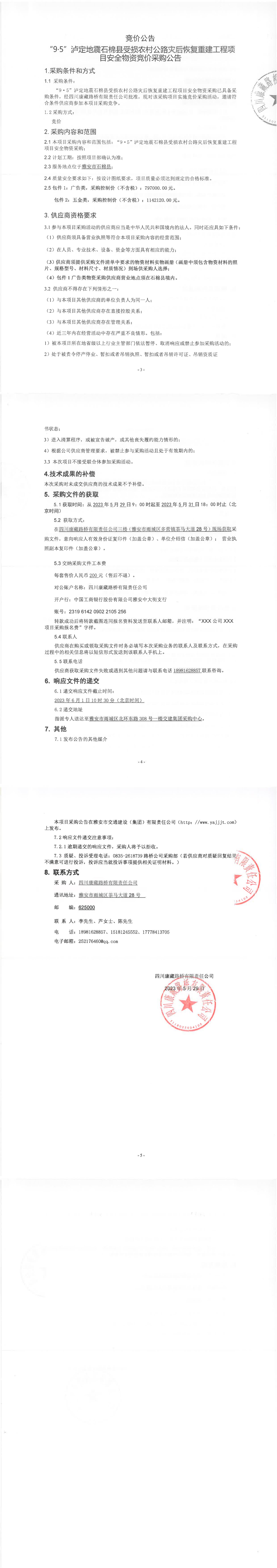 四川康藏路橋有限責任公司“9.5”瀘定地震石棉縣受損農(nóng)村公路災后恢復重建工程項目安全物資競價采購公告
