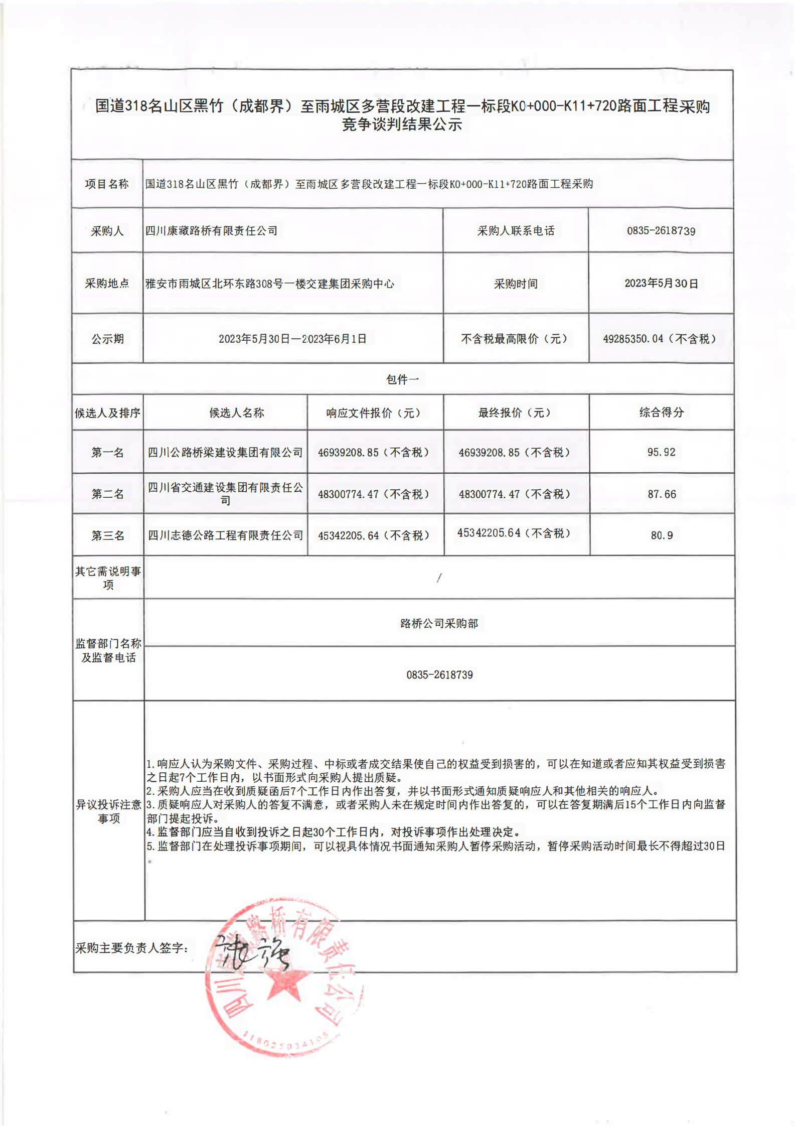 四川康藏路橋有限責(zé)任公司國道318名山區(qū)黑竹(成都界)至雨城區(qū)多營段改建工程一標(biāo)段K0+000-K11+720路面工程采購競(jìng)爭(zhēng)談判結(jié)果公示
