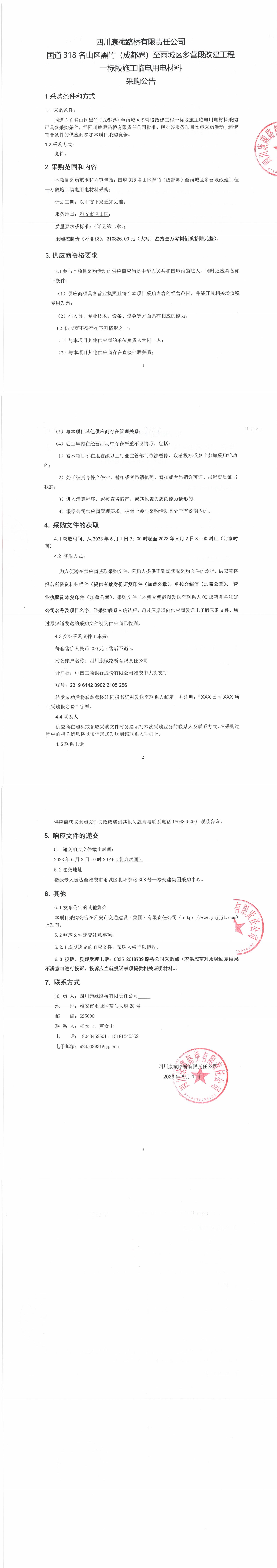 四川康藏路橋有限責任公司國道318名山區(qū)黑竹(成都界)至雨城區(qū)多營段改建工程一標段施工臨電用電材料采購公告