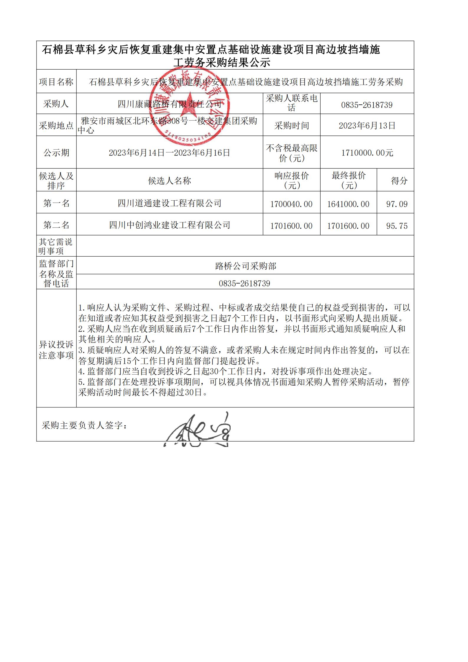 四川康藏路橋有限責(zé)任公司石棉縣草科鄉(xiāng)災(zāi)后恢復(fù)重建集中安置點建設(shè)項目農(nóng)家村村委會邊坡防護工程施工勞務(wù)采購(第三次)結(jié)果公示
