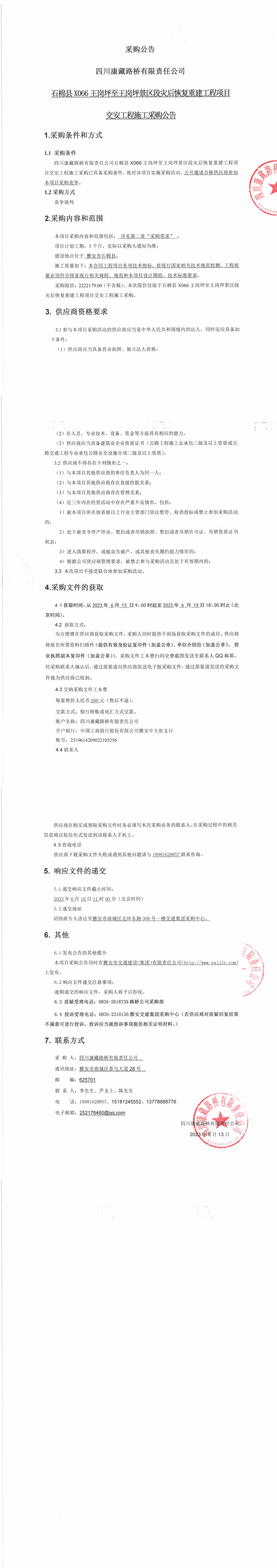 四川康藏路橋有限責(zé)任公司石棉縣X066王崗坪至王崗坪景區(qū)段災(zāi)后恢復(fù)重建工程項(xiàng)目交安工程施工采購公告