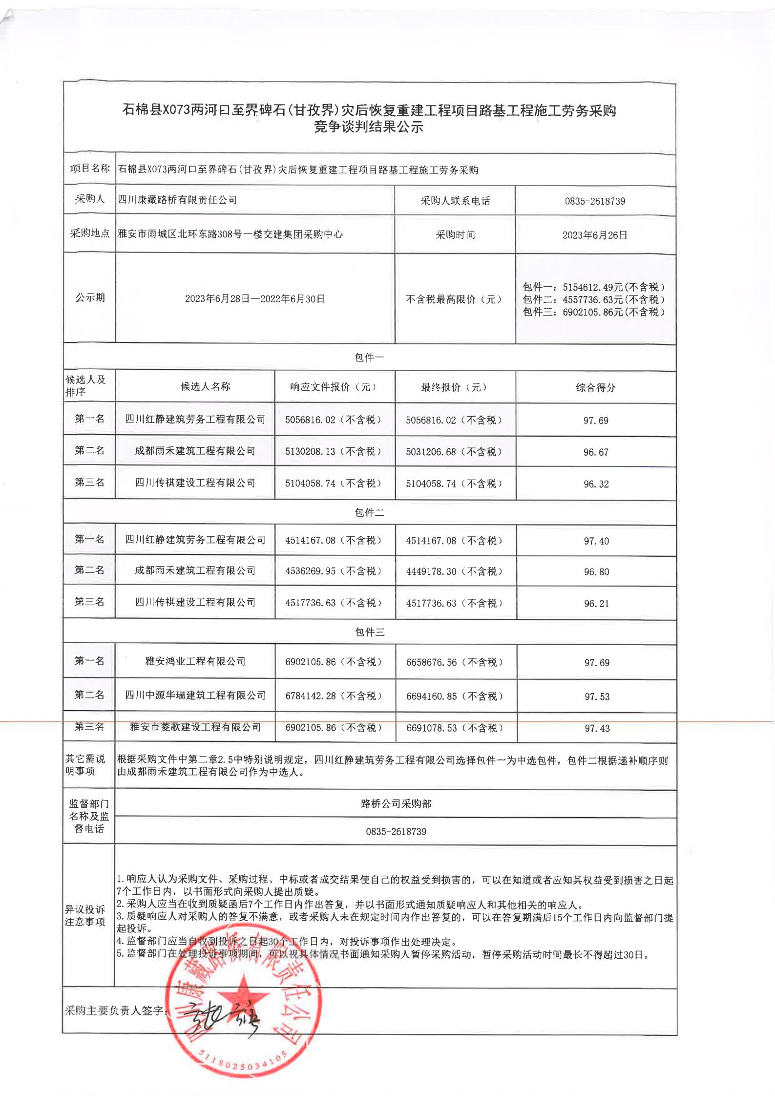 四川康藏路橋有限責(zé)任公司石棉縣X073兩河口至界碑石災(zāi)后恢復(fù)重建工程項目安全物資采購項目競爭談判結(jié)果公示