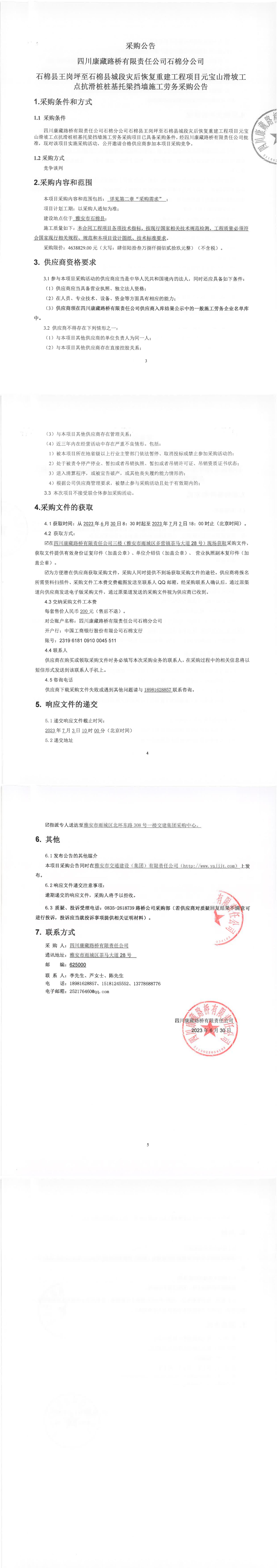 四川康藏路橋有限責任公司石棉縣王崗坪至石棉縣城段災(zāi)后恢復(fù)重建工程項目元寶山滑坡工點抗滑樁樁基托梁擋墻施工勞務(wù)采購公告