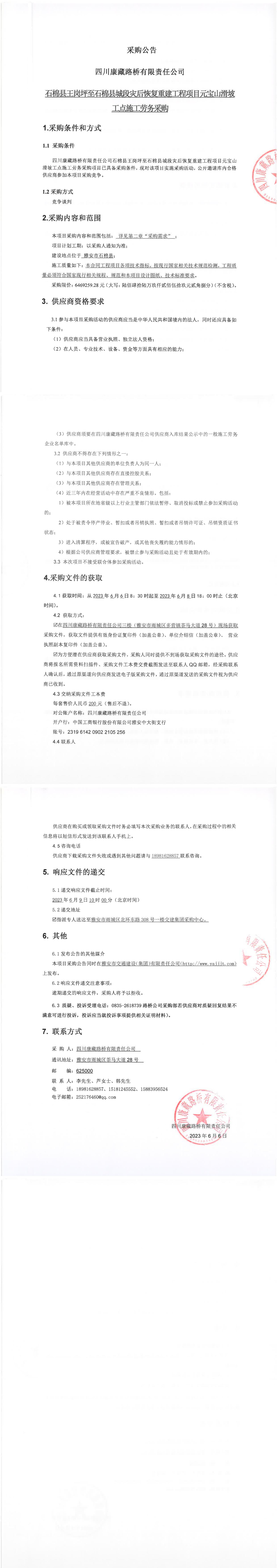 四川康藏路橋有限責(zé)任公司石棉縣王崗坪至石棉縣城段災(zāi)后恢復(fù)重建工程項(xiàng)目元寶山滑坡工點(diǎn)施工勞務(wù)采購