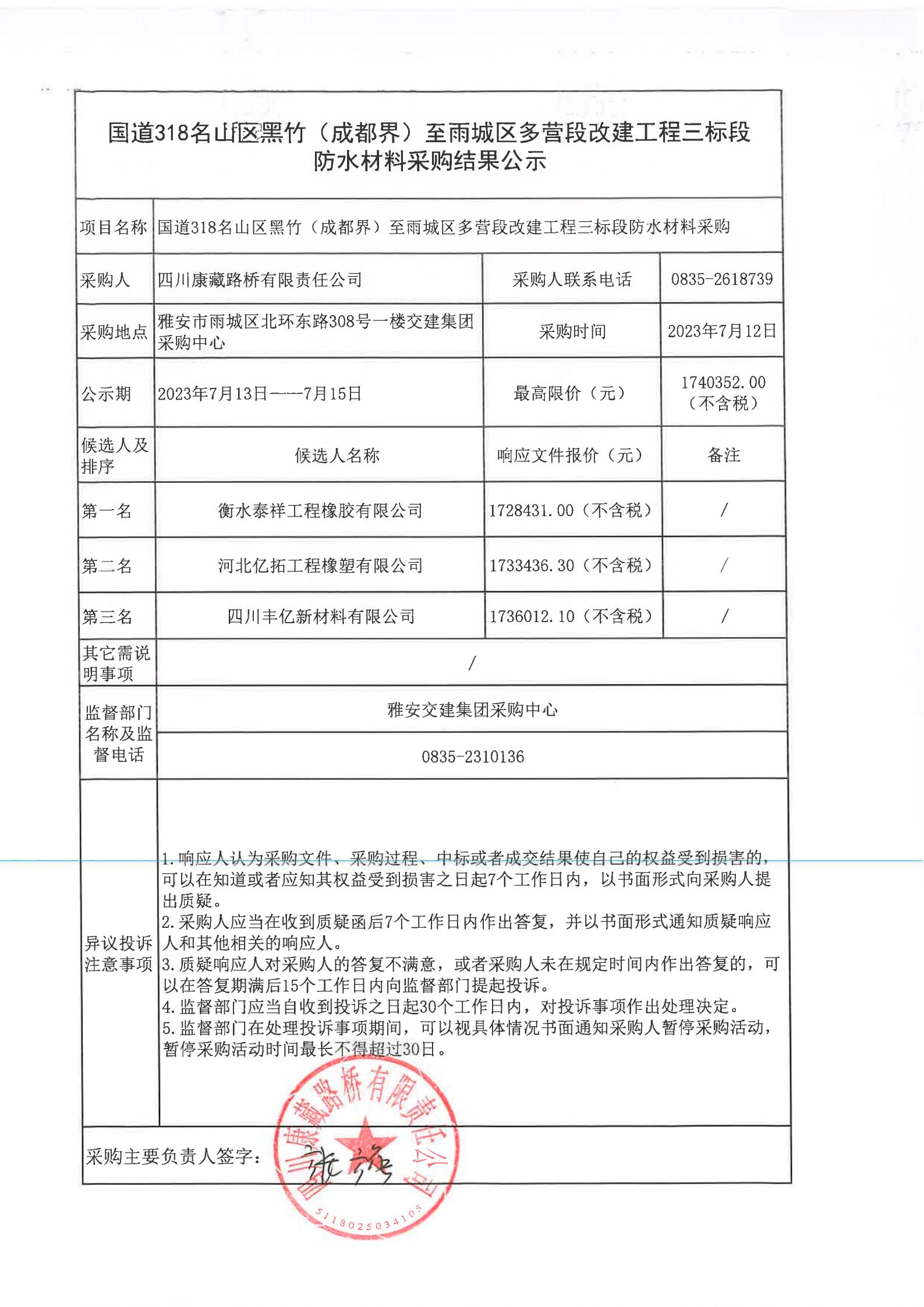 四川康藏路橋有限責任公司國道318名山區(qū)黑竹(成都界)至雨城區(qū)多營段改建工程三標段防水材料采購結(jié)果公示