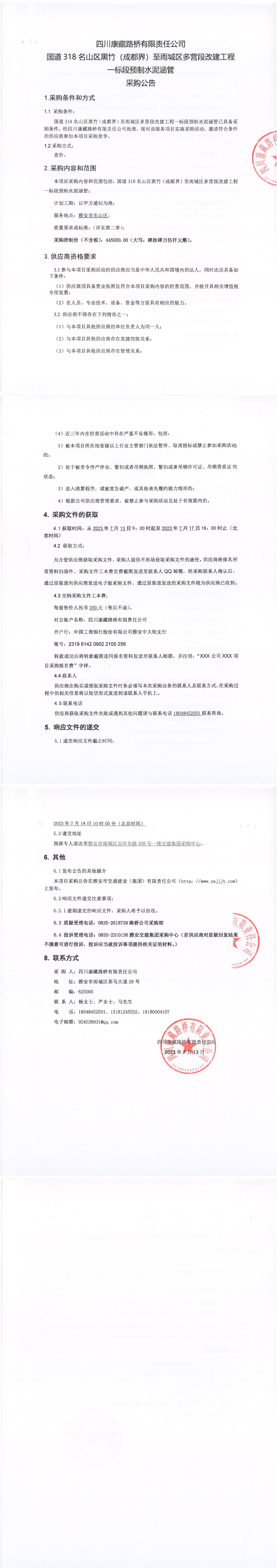 四川康藏路橋有限責(zé)任公司國道318名山區(qū)黑竹(成都界)至雨城區(qū)多營段改建工程一標段預(yù)制水泥涵管采購公告