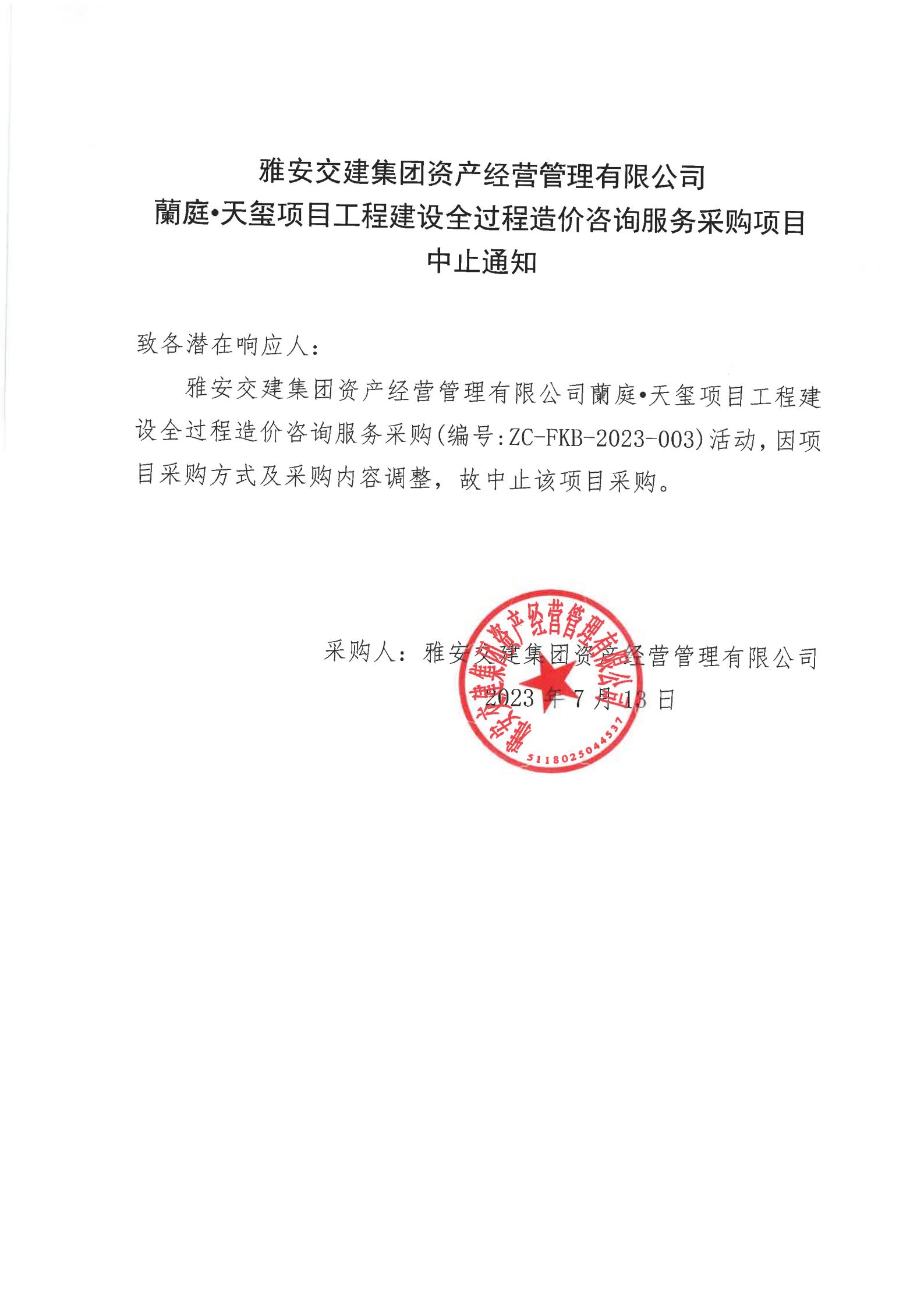 雅安交建集團(tuán)資產(chǎn)經(jīng)營管理有限公司蘭庭·天璽項(xiàng)目工程建設(shè)全過程造價(jià)咨詢服務(wù)采購項(xiàng)目中止通知
