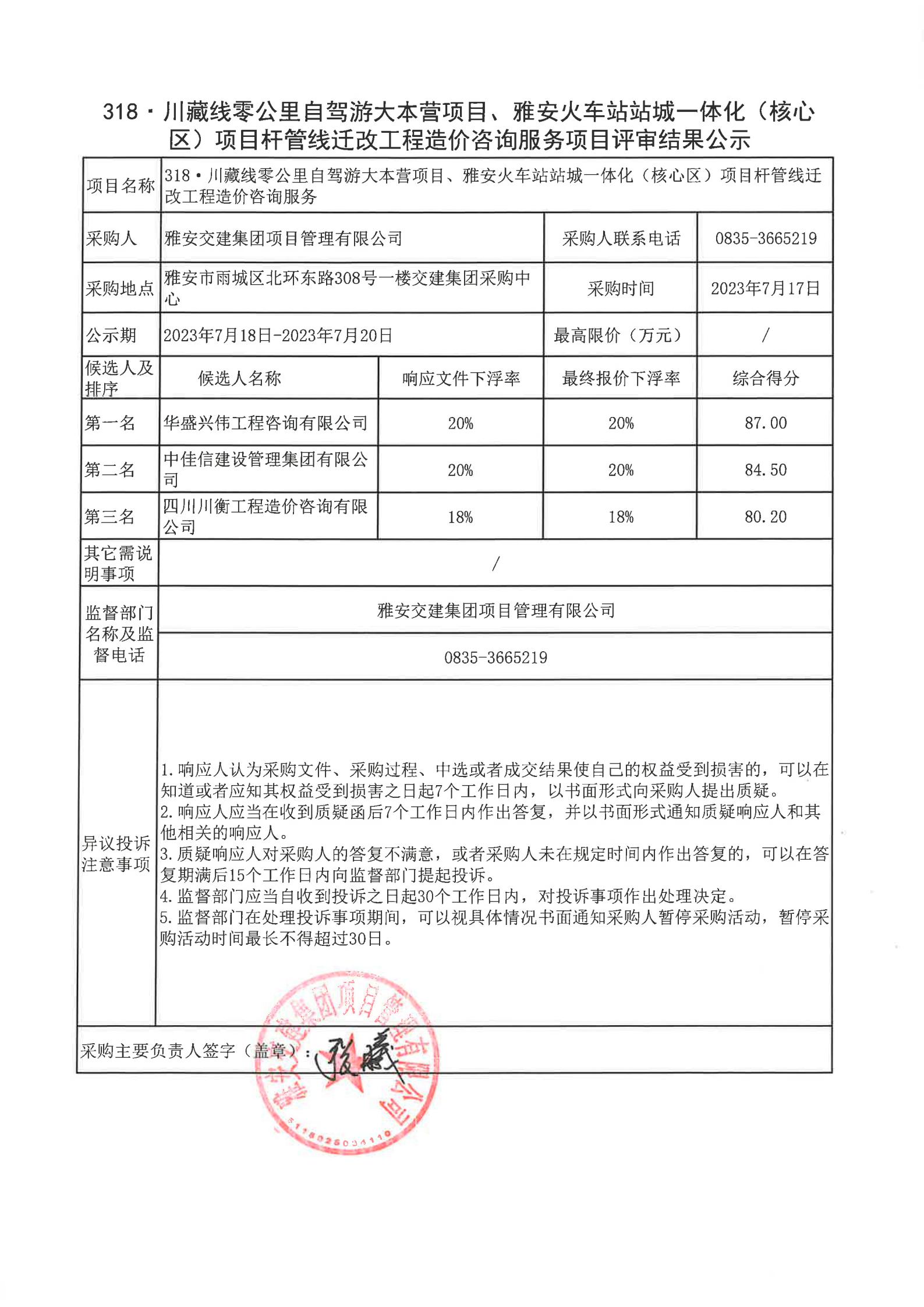 雅安交建集團(tuán)項(xiàng)目管理有限公司318·川藏公路零公里自駕游大本營(yíng)項(xiàng)目、雅安火車(chē)站站城一體化(核心區(qū))項(xiàng)目桿管線(xiàn)遷改工程造價(jià)咨詢(xún)服務(wù)項(xiàng)目評(píng)審結(jié)果公示