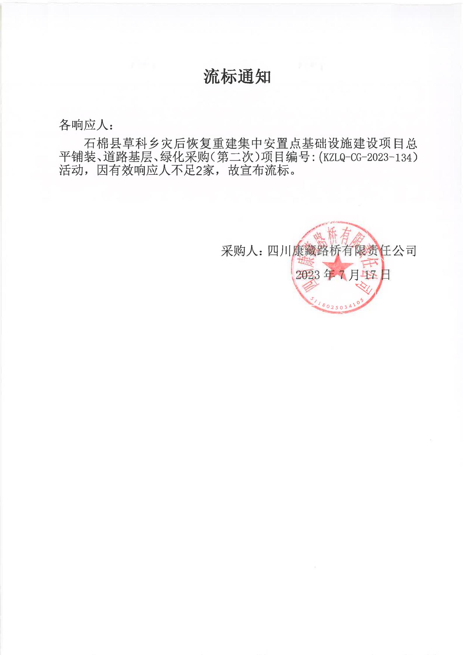 四川康藏路橋有限責任公司石棉縣草科鄉(xiāng)災后恢復重建集中安置點基礎設施建設項目總平鋪裝、道路基層、綠化采購(第二次)流標通知