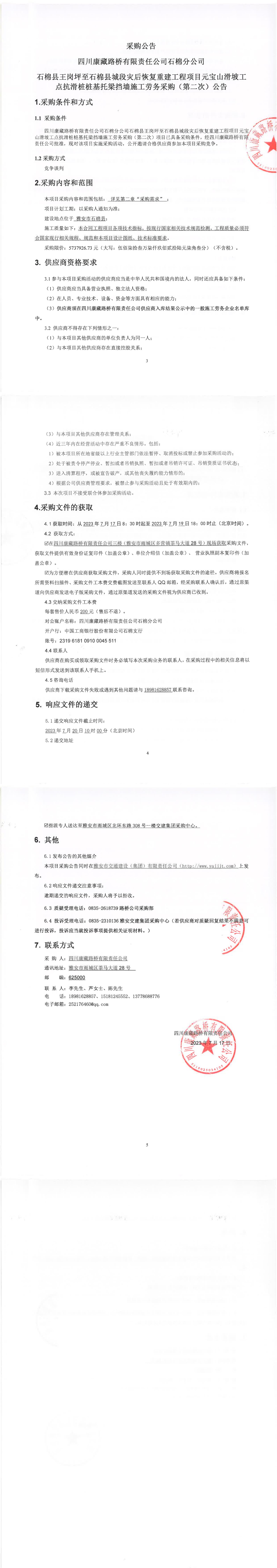 四川康藏路橋有限責任公司石棉分公司石棉縣王崗坪至石棉縣城段災后恢復重建工程項目元寶山滑坡工點抗滑樁樁基托梁擋墻施工勞務采購(第二次)公告