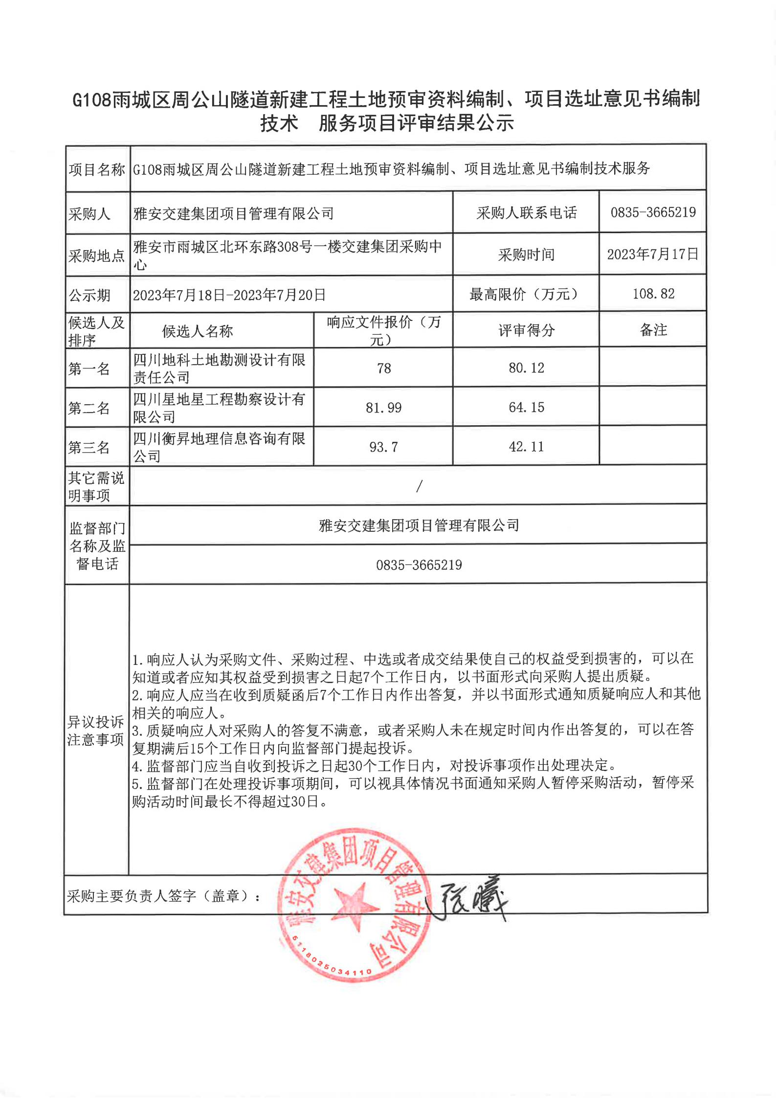 雅安交建集團(tuán)項(xiàng)目管理有限公司G108雨城區(qū)周公山隧道新建工程土地預(yù)審資料編制、項(xiàng)目選址意見書編制技術(shù)服務(wù)項(xiàng)目評審結(jié)果公示