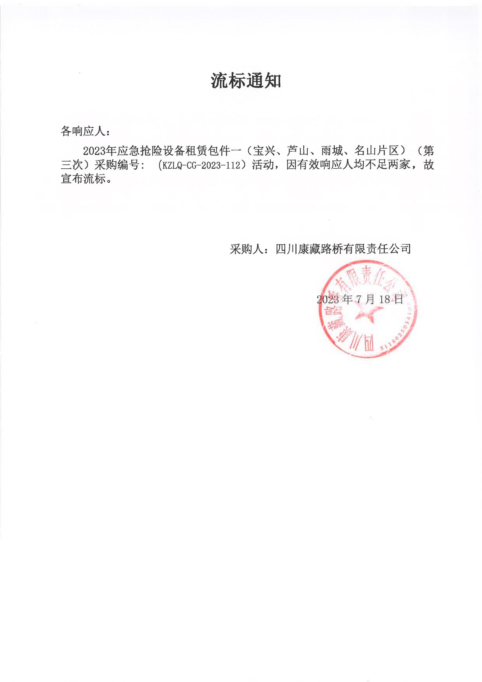 四川康藏路橋有限責(zé)任公司2023年應(yīng)急搶險設(shè)備租賃包件一(寶興、蘆山、雨城、名山片區(qū))(第三次)流標(biāo)通知