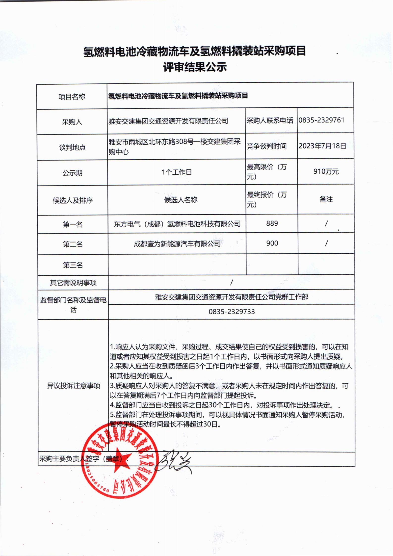 雅安交建集團交通資源開發(fā)有限責任公司氫燃料撬裝站采購項目評審結(jié)果公示