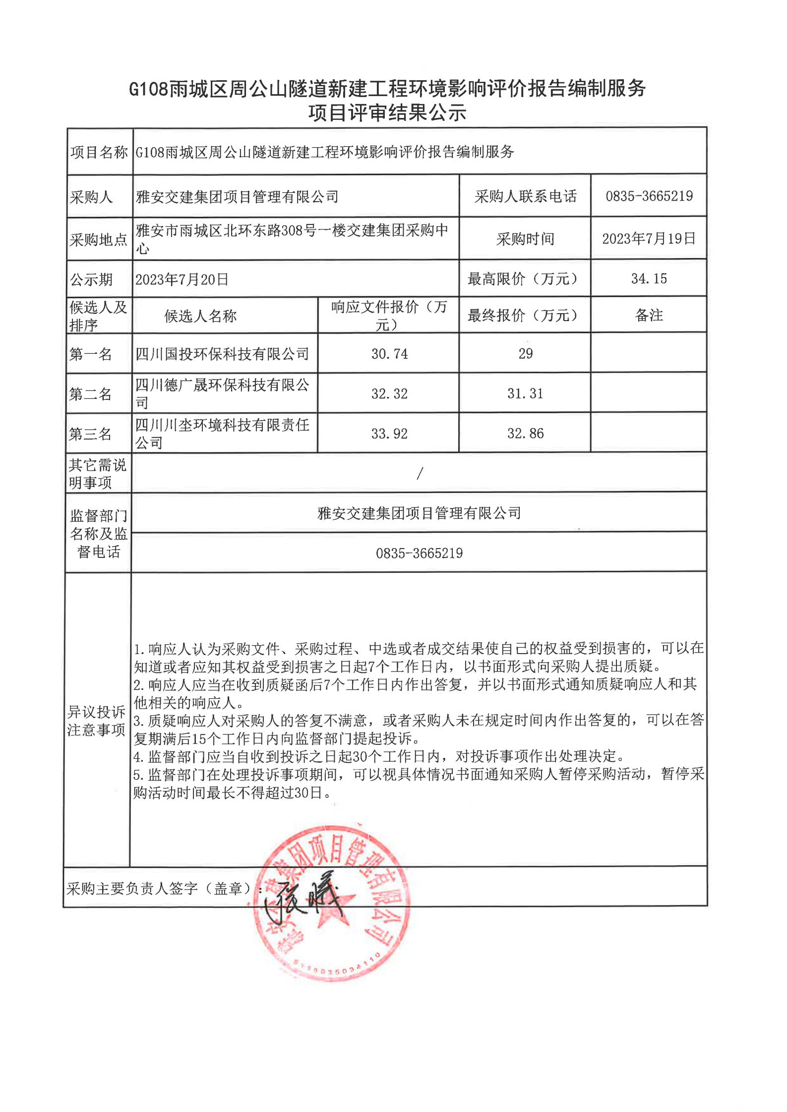 雅安交建集團項目管理有限公司G108雨城區(qū)周公山隧道新建工程環(huán)境影響評價報告編制服務項目評審結(jié)果公示