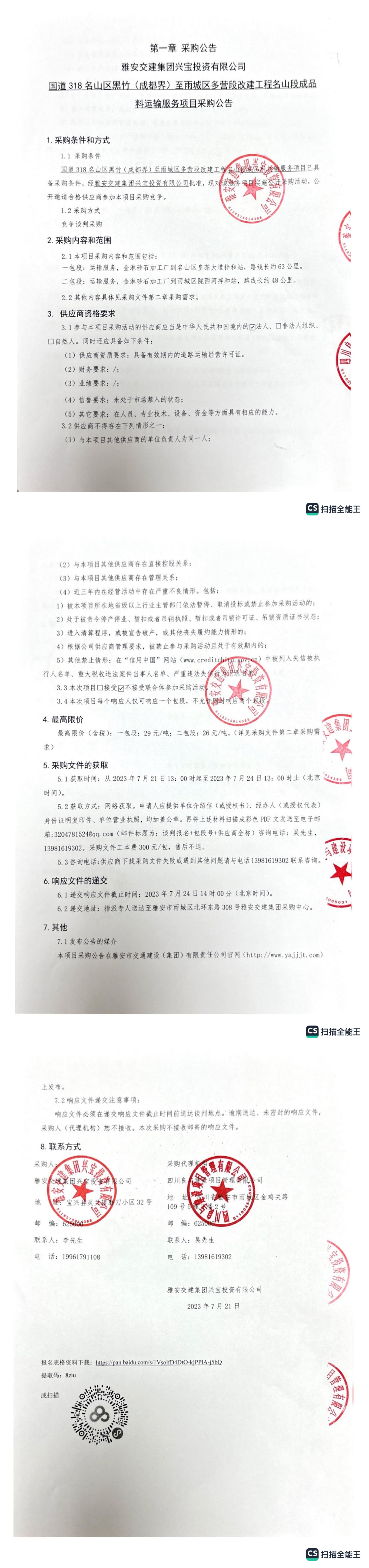 雅安交建集團(tuán)興寶投資有限公司國(guó)道318名山區(qū)黑竹(成都界)至雨城區(qū)多營(yíng)段改建工程名山段成品料運(yùn)輸服務(wù)項(xiàng)目采購(gòu)公告