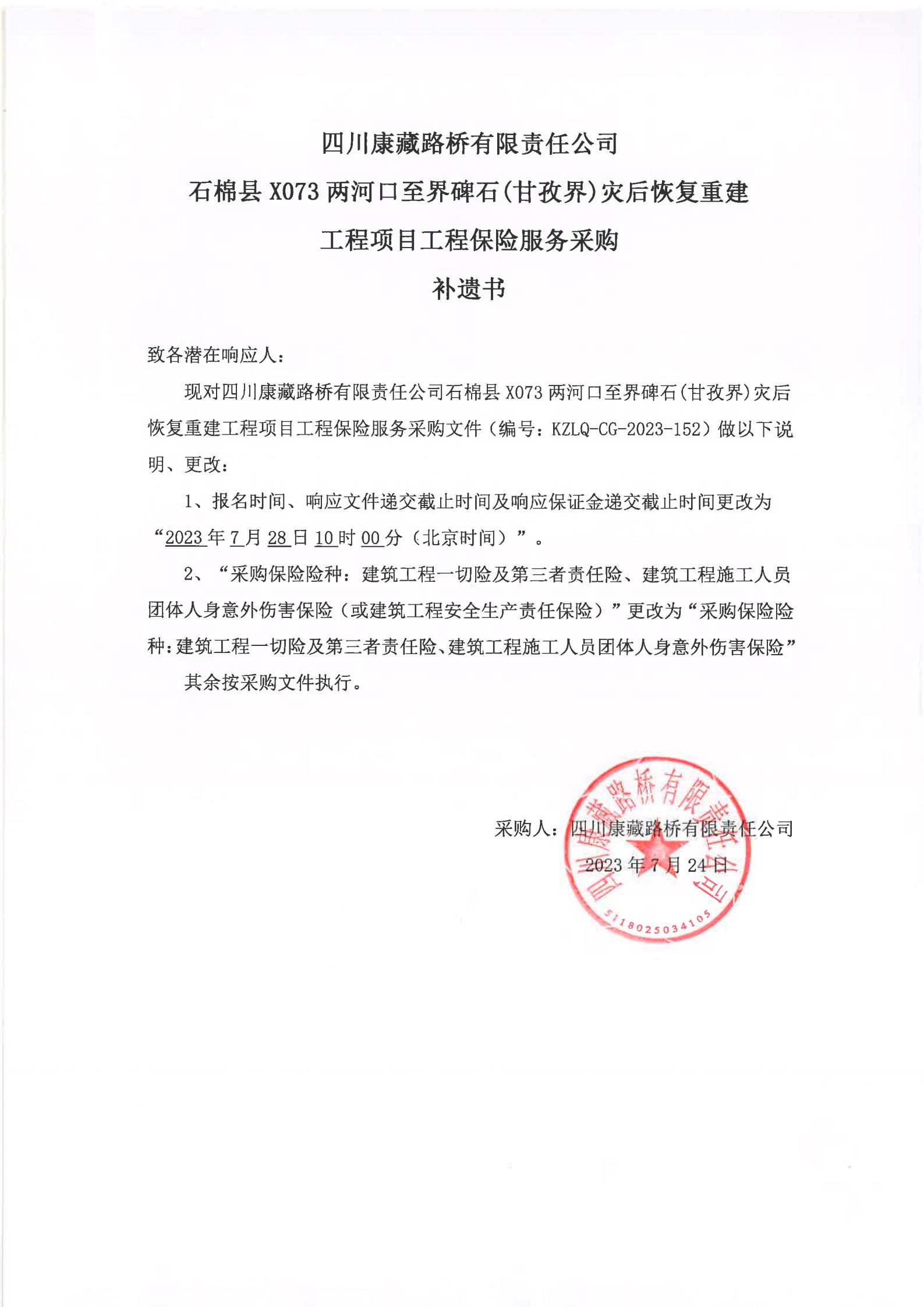 四川康藏路橋有限責(zé)任公司石棉縣X073兩河口至界碑石(甘孜界)災(zāi)后恢復(fù)重建工程項(xiàng)目工程保險(xiǎn)服務(wù)采購補(bǔ)遺書